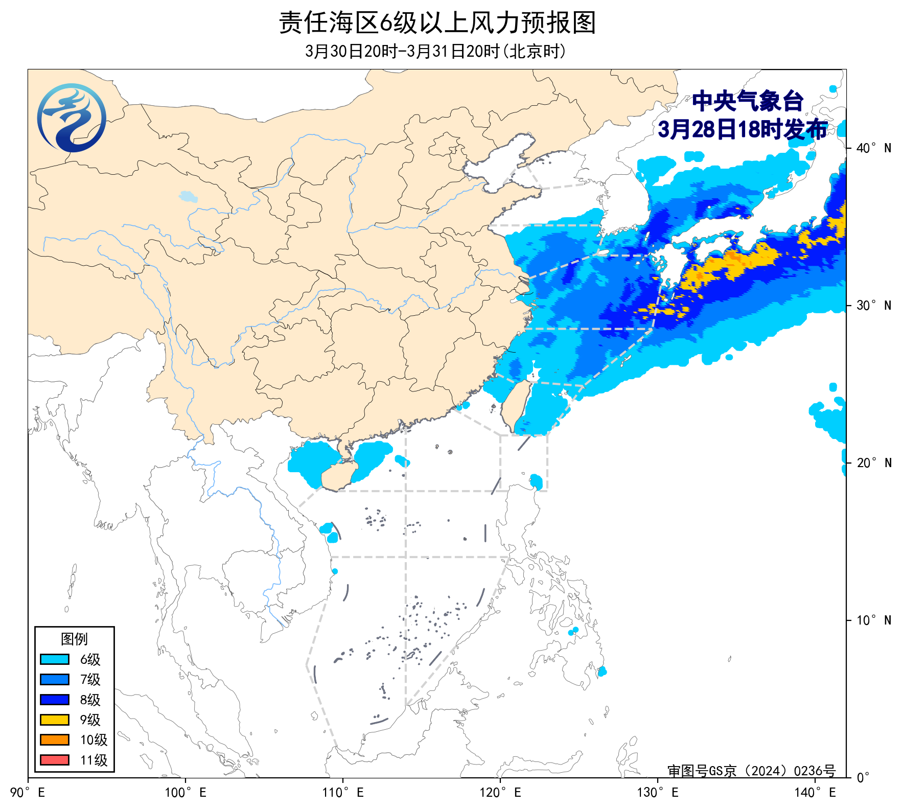 预计,3月31日夜间至4月4日白天,渤海、黄海大部海域、台湾海峡、台湾以东洋面、巴士海峡、北部湾、南海大部海域将有6~7级、阵风8级的风,渤海海峡、琼州海峡将有5~6级、阵风7级的风,东海大部海域将有6~7级、阵风8级增大至8~9级、阵风10级的大风。