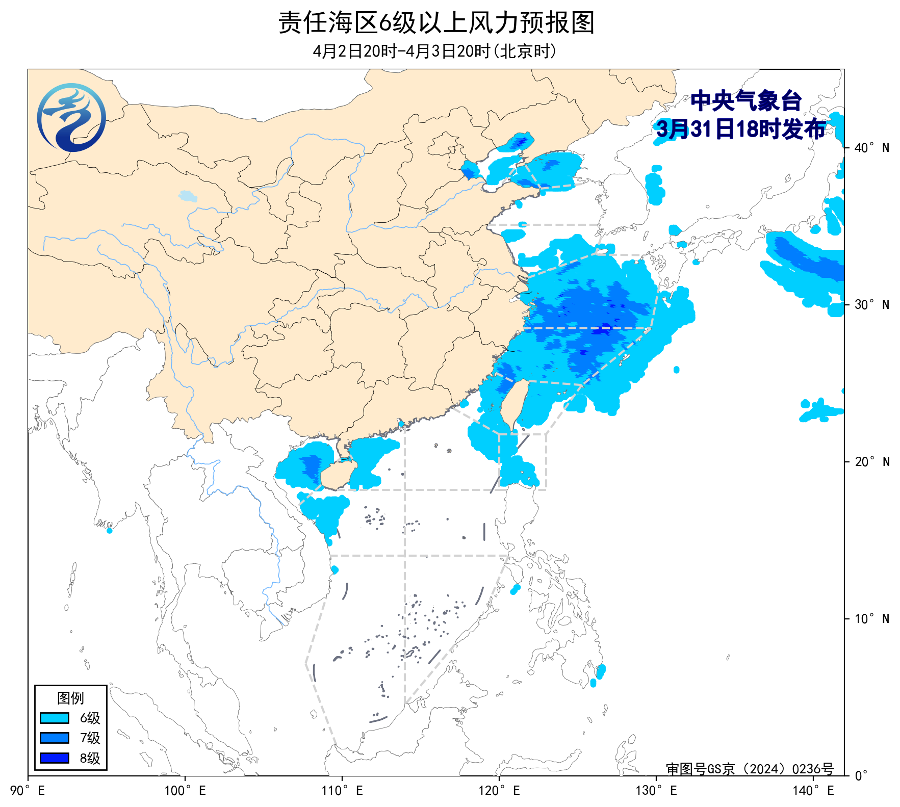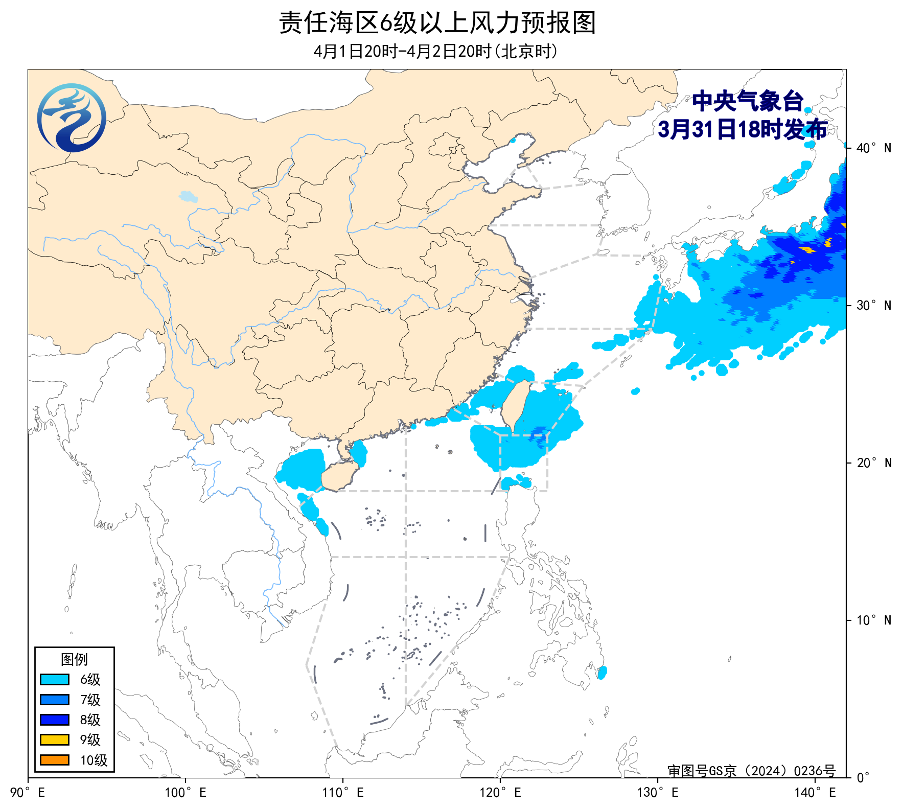 3月31日20时至4月1日20时,东海南部海域将有5~6级、阵风7级的西南风转偏北风,台湾以东洋面将有5~6级、阵风7级的偏南转偏北风,渤海、东海北部海域将有5~6级、阵风7级的偏北到东北风。