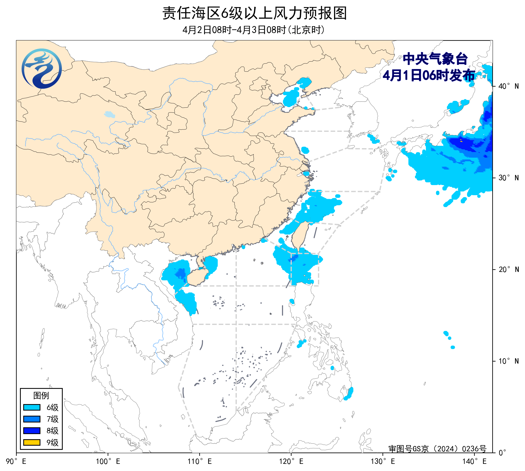 3月31日14时至4月1日02时,东海南部海域出现了5~6级、阵风7级的旋转风,台湾以东洋面、南海西北部海域出现了5~6级、阵风7级的偏南风。