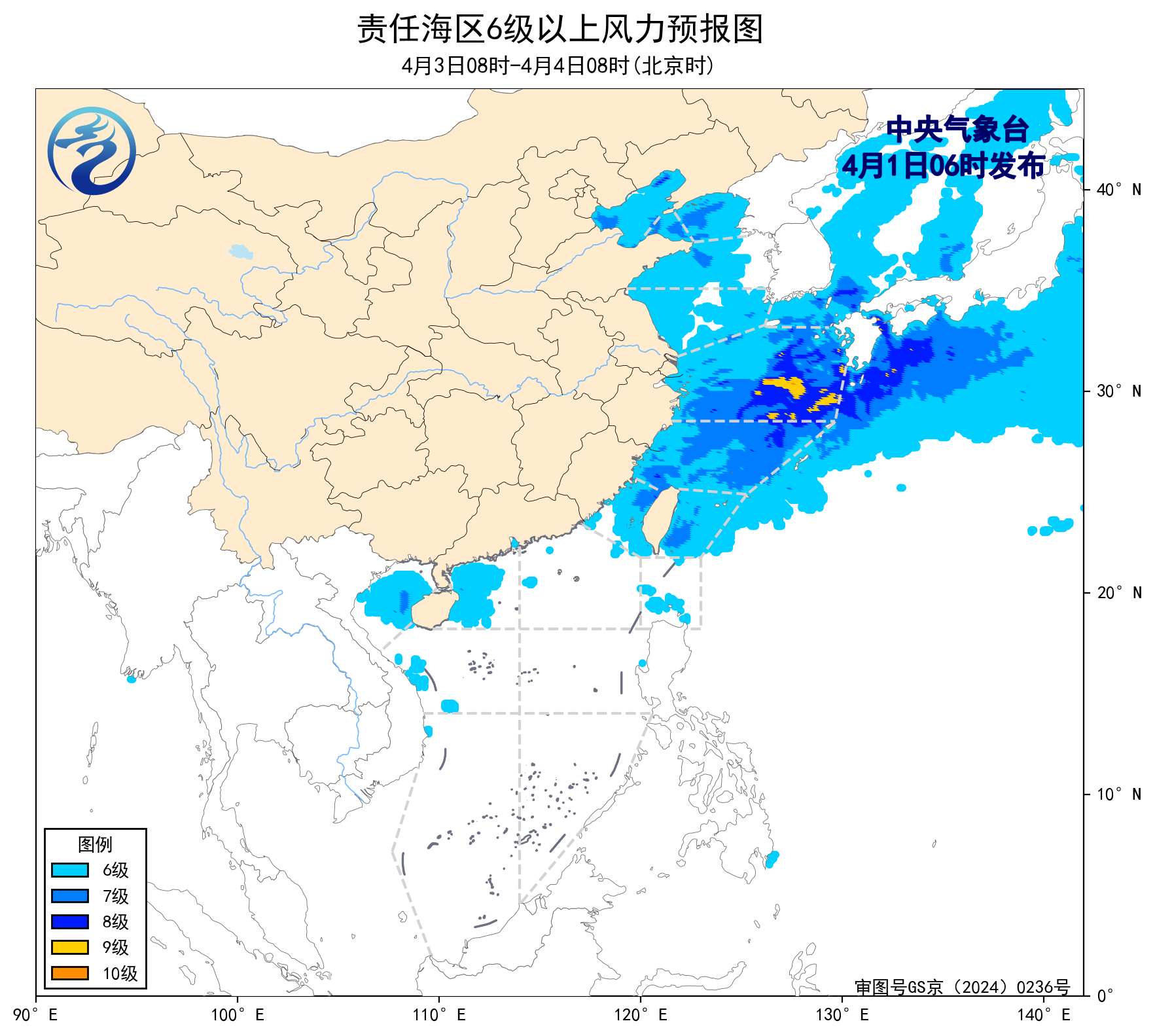 3日08时至4日08时,东海北部海域将有7~8级、阵风9级的偏南风,渤海海峡、黄海北部海域、东海南部海域将有6~7级、阵风8级的偏南风,渤海将有5~6级、阵风7级的偏南转偏北风,黄海中部海域将有5~6级、阵风7级的偏南转西北风,黄海南部海域将有5~6级、阵风7级的东南风转西北风,台湾海峡、台湾以东洋面、北部湾、南海西北部海域将有5~6级、阵风7级的偏南到西南风。