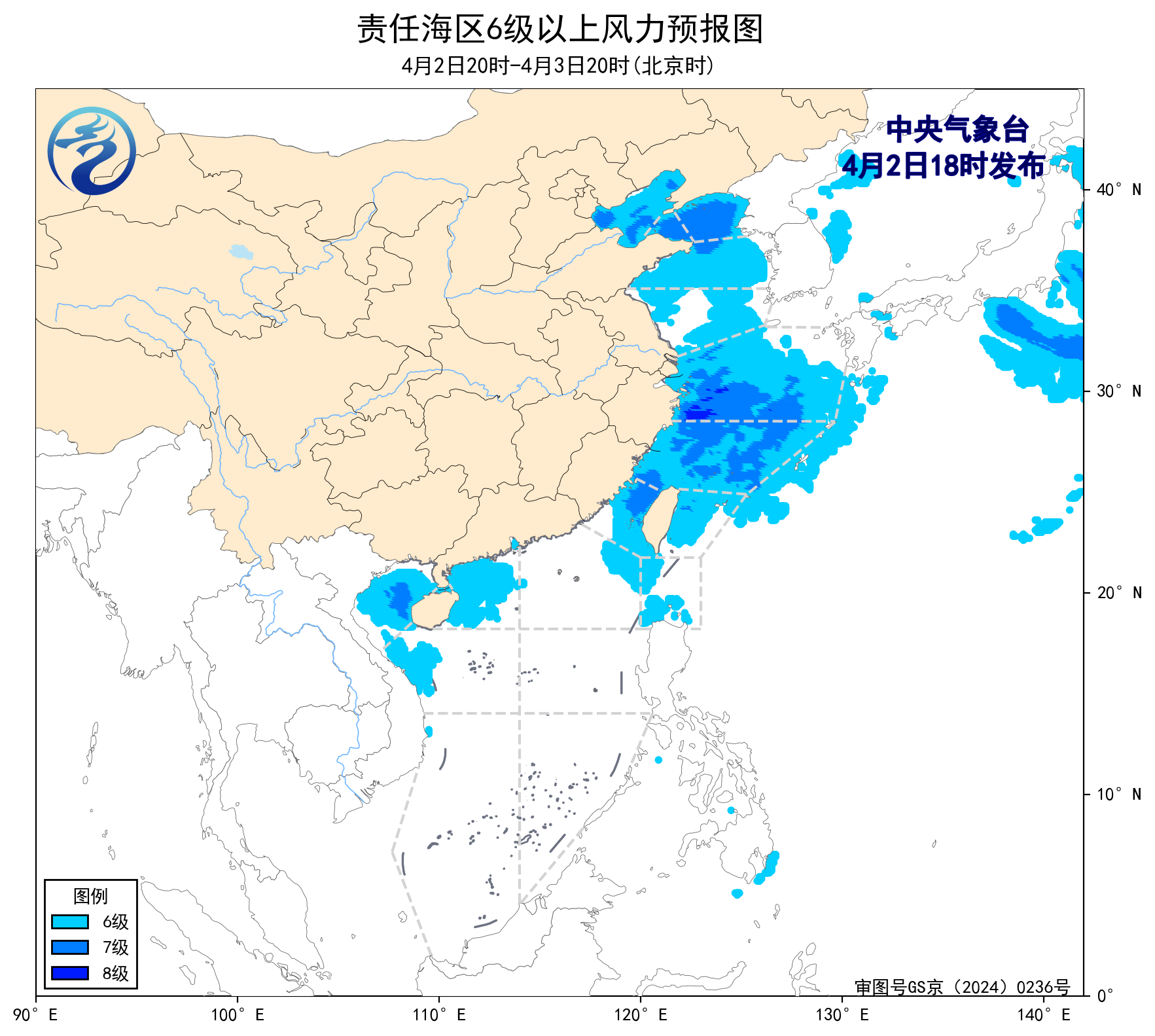 4月2日02时至14时,台湾海峡出现了5~6级、阵风7级的偏北风,巴士海峡、南海东北部海域出现了5~6级、阵风7级的偏东风,北部湾出现了5~6级、阵风7级的偏南风。
