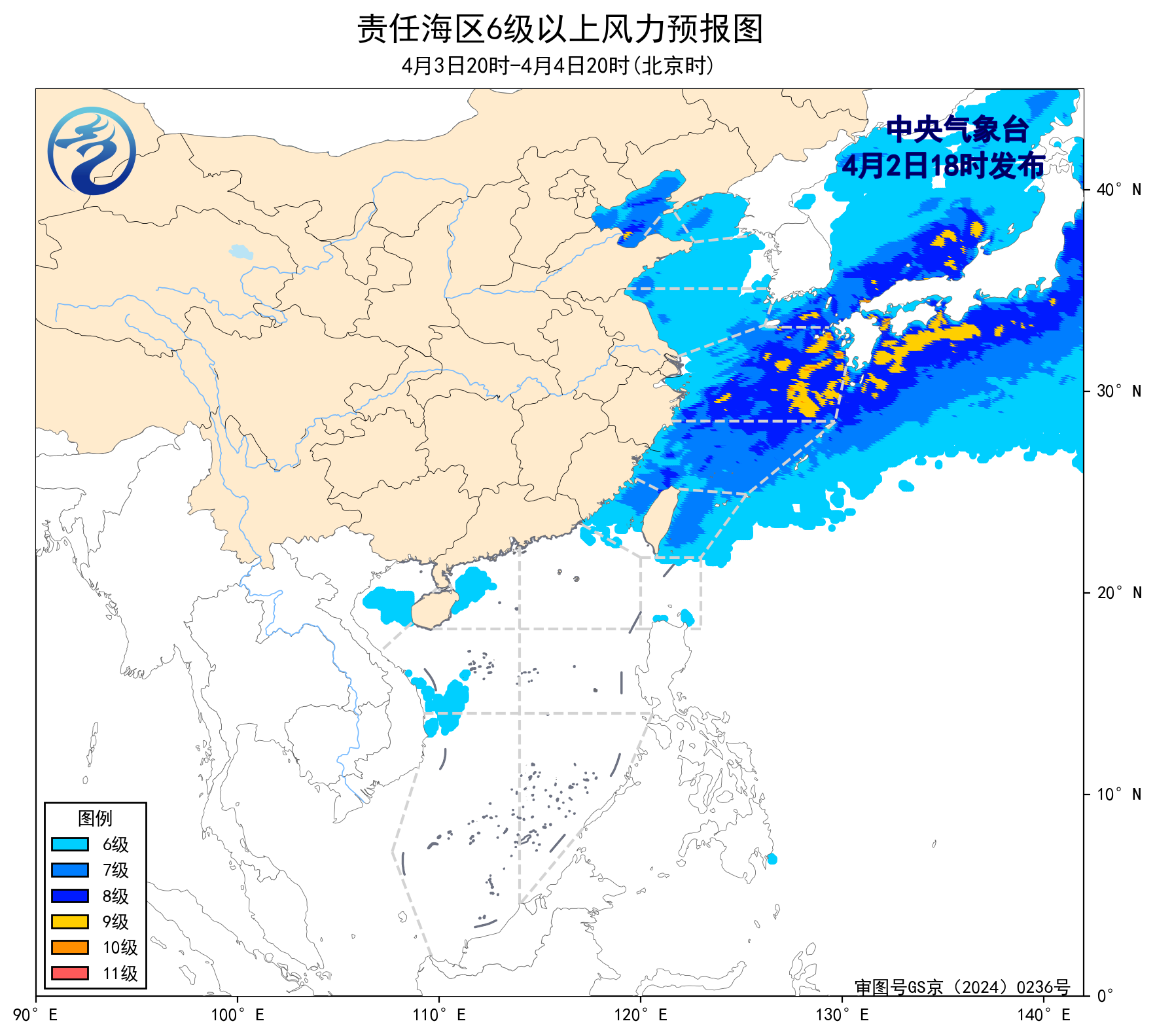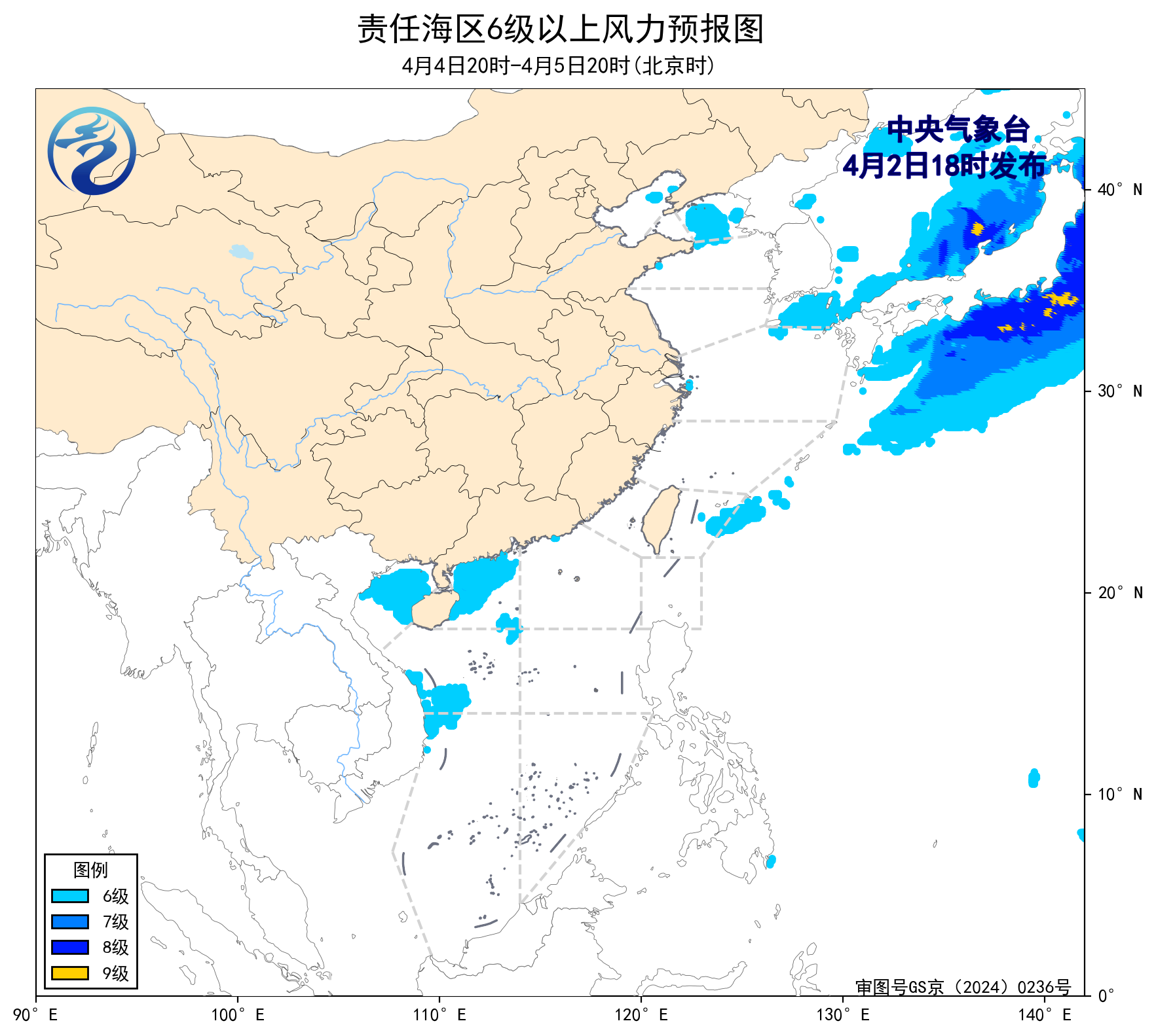 预计,4月5日夜间至9日白天,渤海、黄海大部海域、北部湾、南海大部海域将有6~7级、阵风8级的风,渤海海峡、巴士海峡、琼州海峡将有5~6级、阵风7级的风,东海大部海域、台湾海峡、台湾以东洋面将有7~8级、阵风9级的大风。