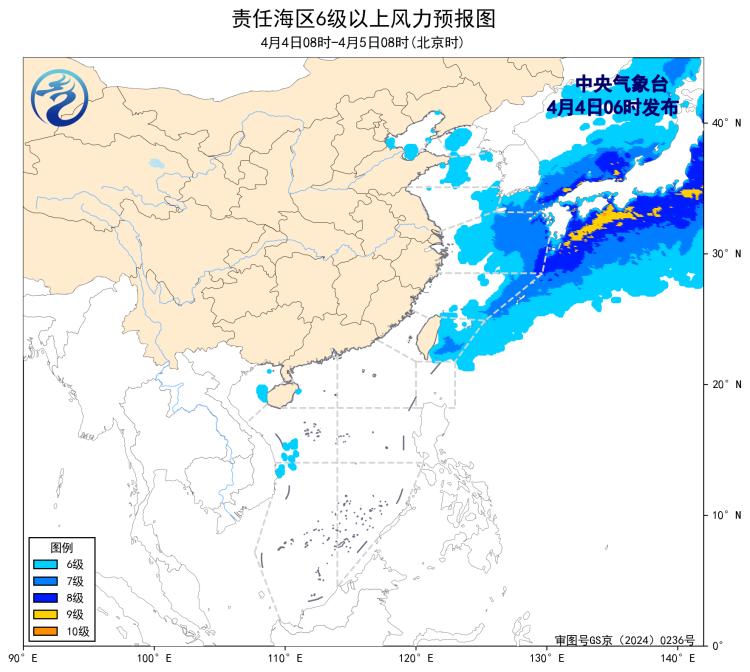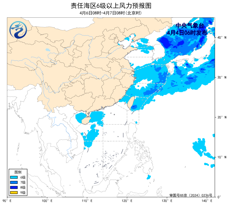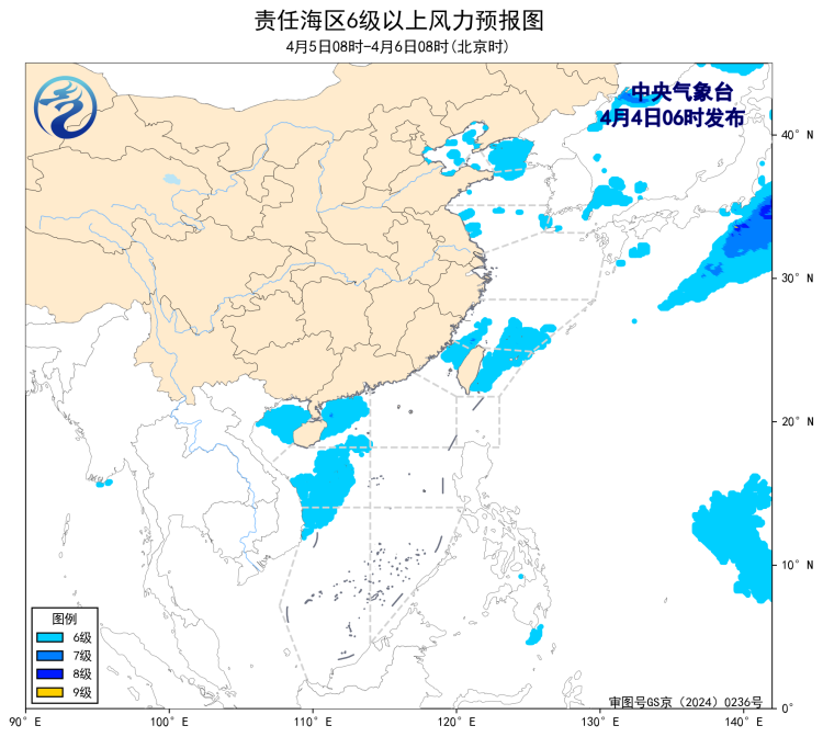 4日08时至5日08时,东海东部海域、台湾以东洋面将有7~8级、阵风9级的风,黄海中部和南部海域将有5~6级、阵风7级的偏北风,黄海北部海域将有5~6级、阵风7级的偏南到西南风。