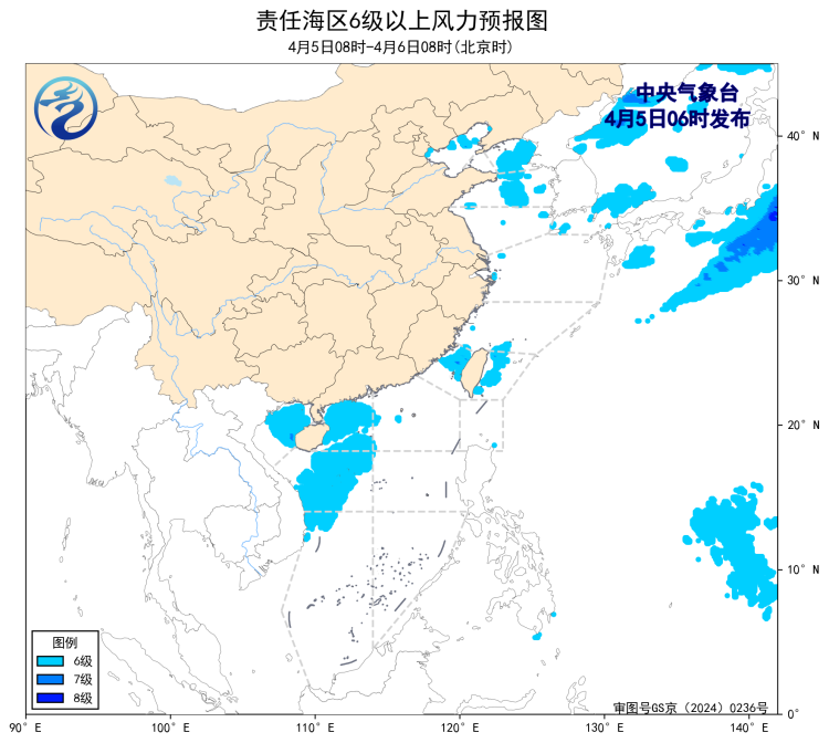 6日08时至7日08时,东海东部海域将有6~8级、阵风9级的偏北风,台湾以东洋面将有6~7级、阵风8级的西南风,台湾海峡、北部湾、南海西北部和中西部海域将有5~6级、阵风7级的偏南到西南风。