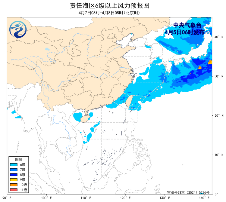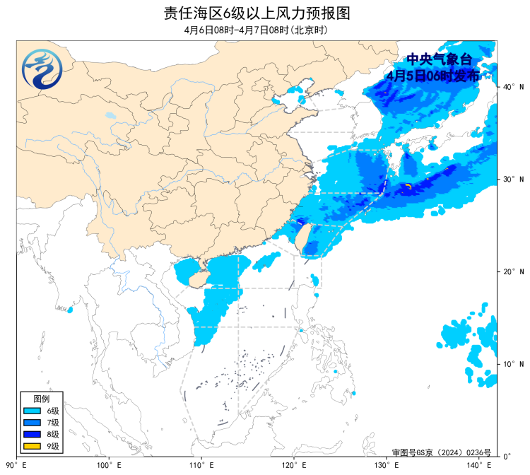 4月4日14时至5日02时,东海北部海域出现了5~6级、阵风7级的偏西风。