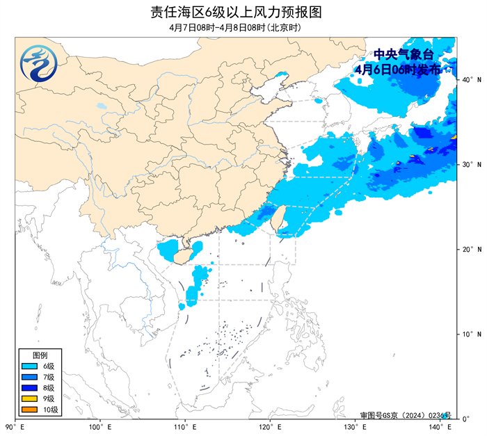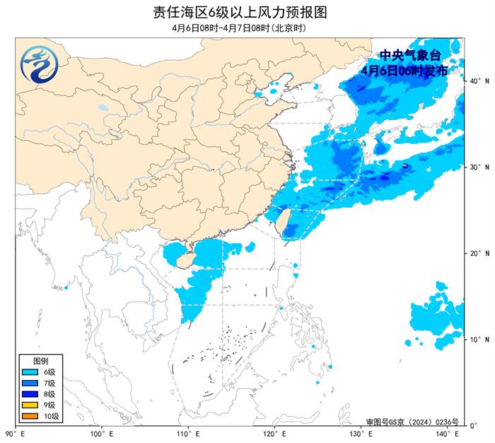 6日08时至14时,黄海东部海域、东海西北部海域、杭州湾将有能见度不足1公里的大雾;6日08时至7日08时,东海东部海域将有6~8级、阵风9级的西南风,台湾海峡、台湾以东洋面、北部湾、南海西北部和中西部海域将有5~6级、阵风7级的偏南到西南风。