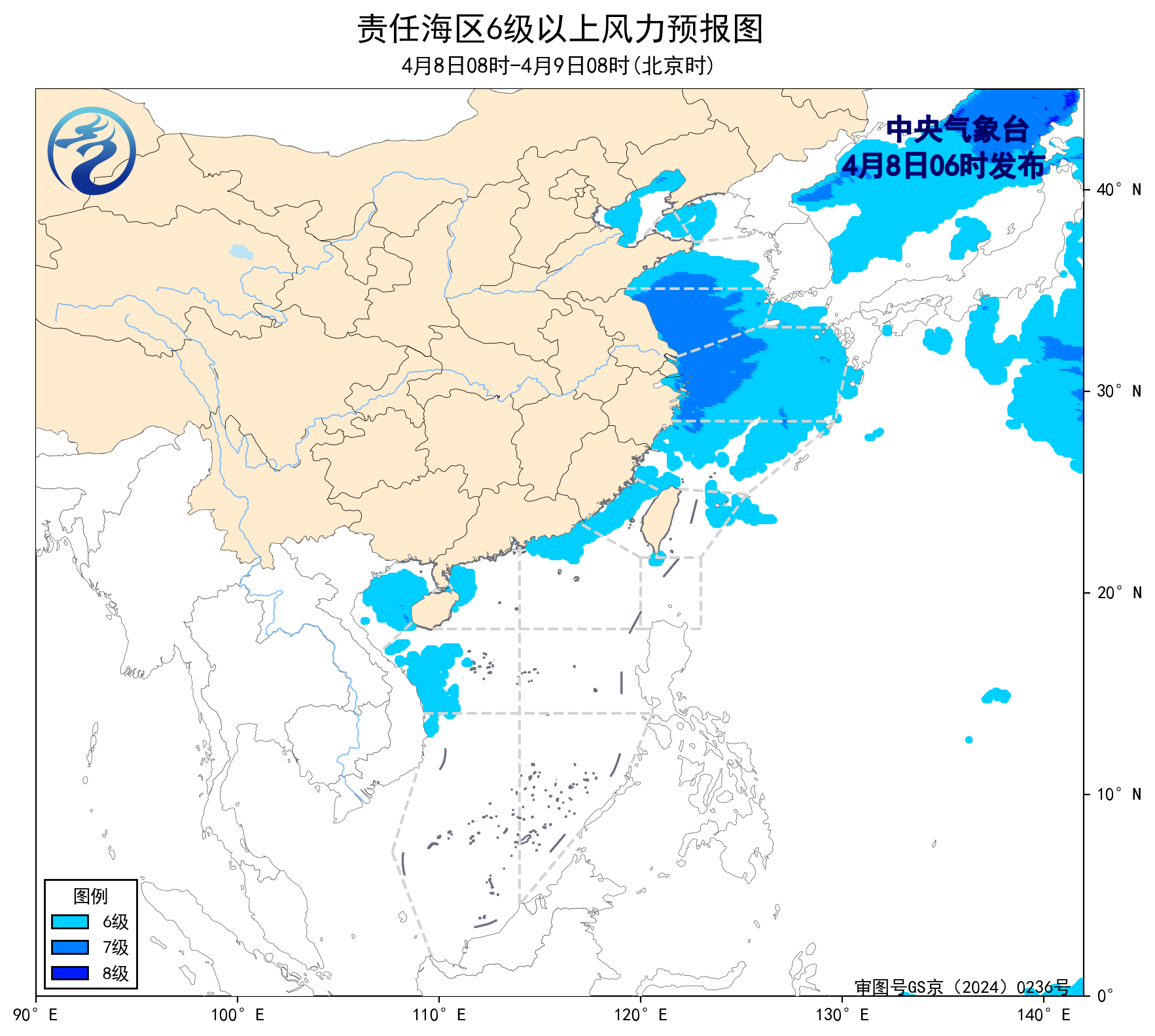 8日08时至9日08时,黄海中部和南部海域、东海西北部海域将有6~7级、阵风8级的偏南到东南风,渤海、渤海海峡、黄海北部海域、东海东北部和南部海域、北部湾、南海中西部海域将有5~6级、阵风7级的偏南风,台湾海峡将有5~6级、阵风7级的东北风。