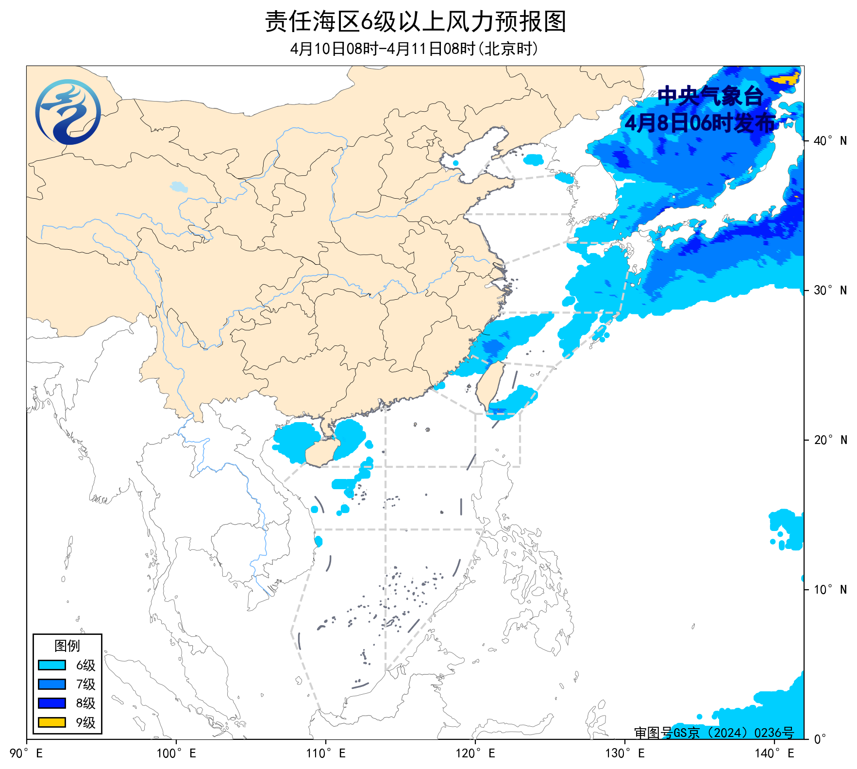 9日08时至10日08时,黄海南部海域、东海北部和西南部海域将有6~7级、阵风8级的偏南到西南风,东海东南部海域、台湾海峡、台湾以东洋面、北部湾、南海西北部海域将有5~6级、阵风7级的偏南到西南风,黄海北部和中部海域将有5~6级、阵风7级的偏东到东南风。