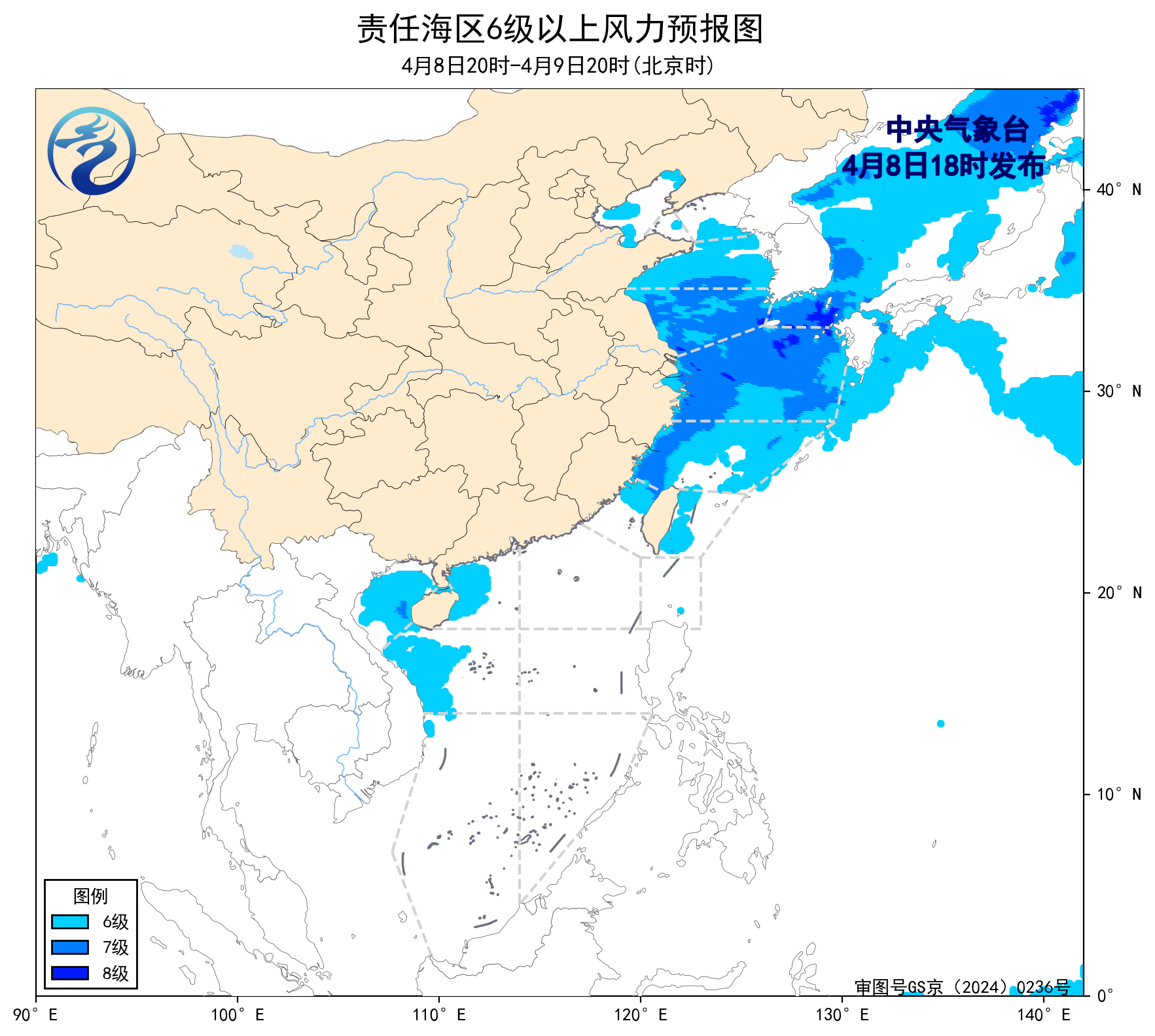 4月8日02时至14时,东海大部海域、台湾以东洋面、南海东北部海域出现了5~6级、阵风7级的偏东风,台湾海峡出现了5~6级、阵风7级的偏北风,北部湾出现了5~6级、阵风7级的偏南风。