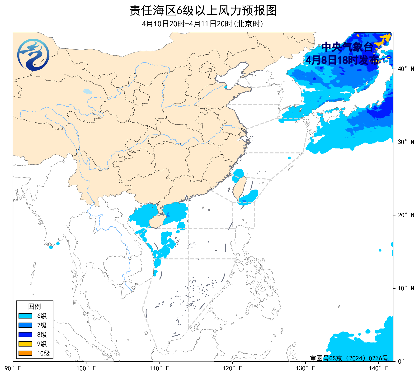 9日20时至10日20时,东海大部海域将有6~7级、阵风8级的西南风,台湾海峡、台湾以东洋面、北部湾、南海西北部海域将有5~6级、阵风7级的偏南到西南风。