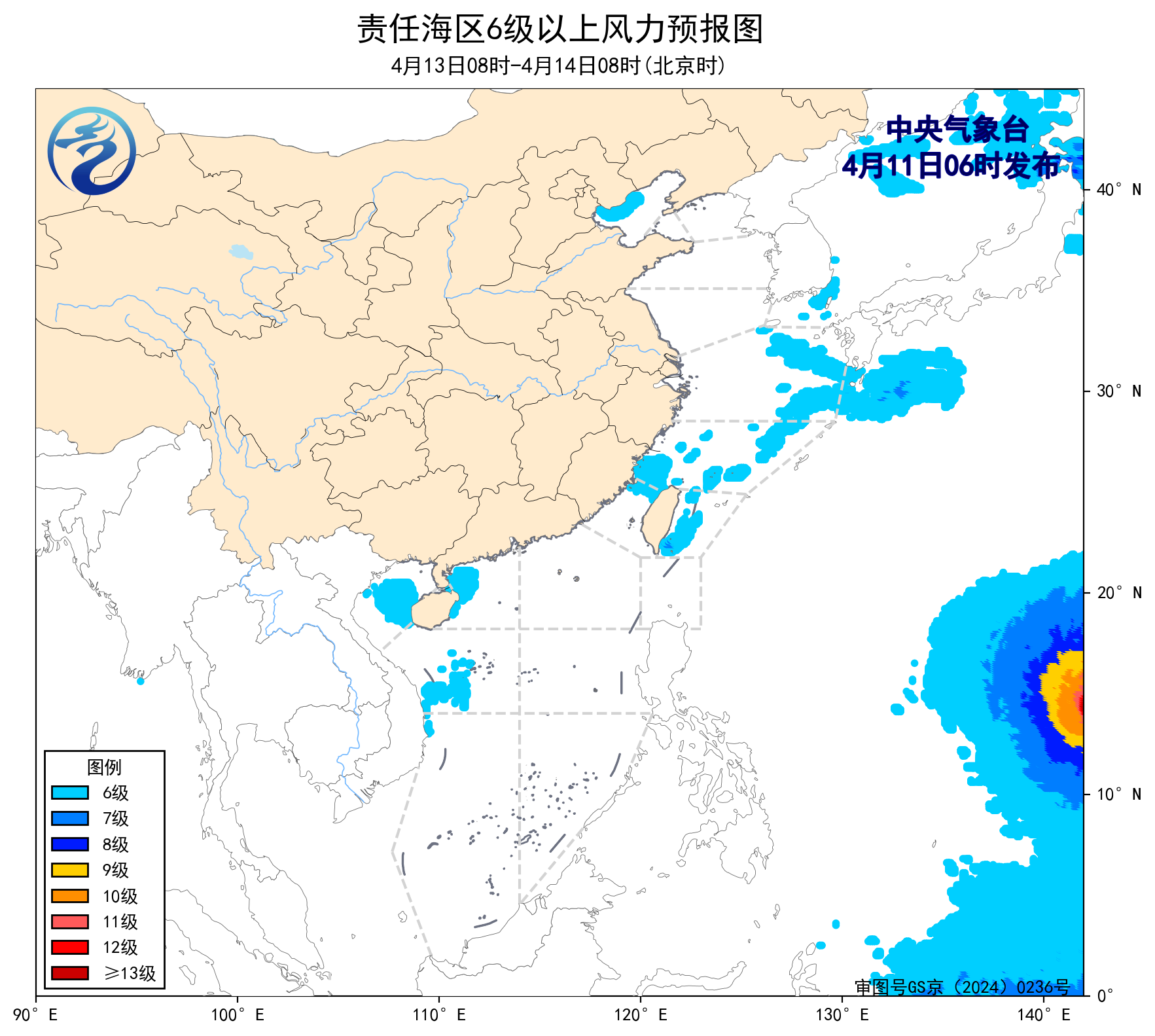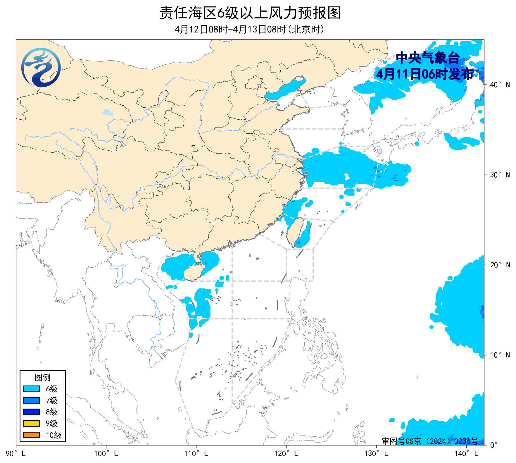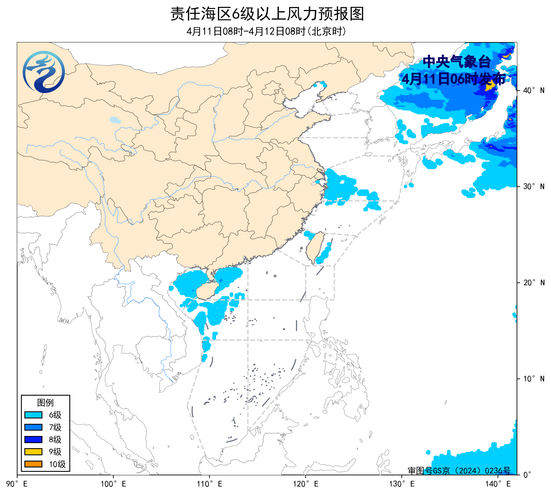 11日08时至12日08时,东海北部海域将有5~6级、阵风7级的偏东风,北部湾、南海西北部和中西部海域将有5~6级、阵风7级的偏南风。