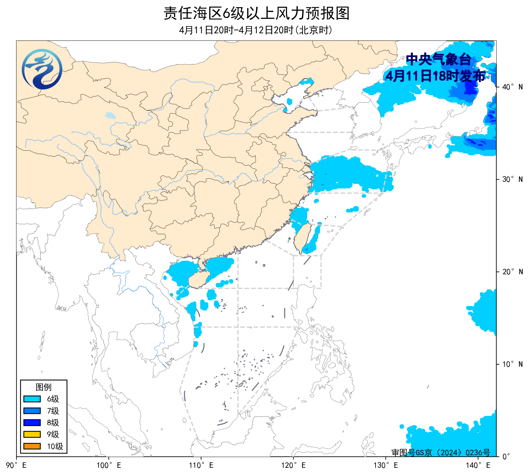 4月11日02时至14时,南海西北部海域、北部湾出现了5~6级、阵风7级的偏南风。黄海北部和南部海域出现了能见度不足1公里的大雾。