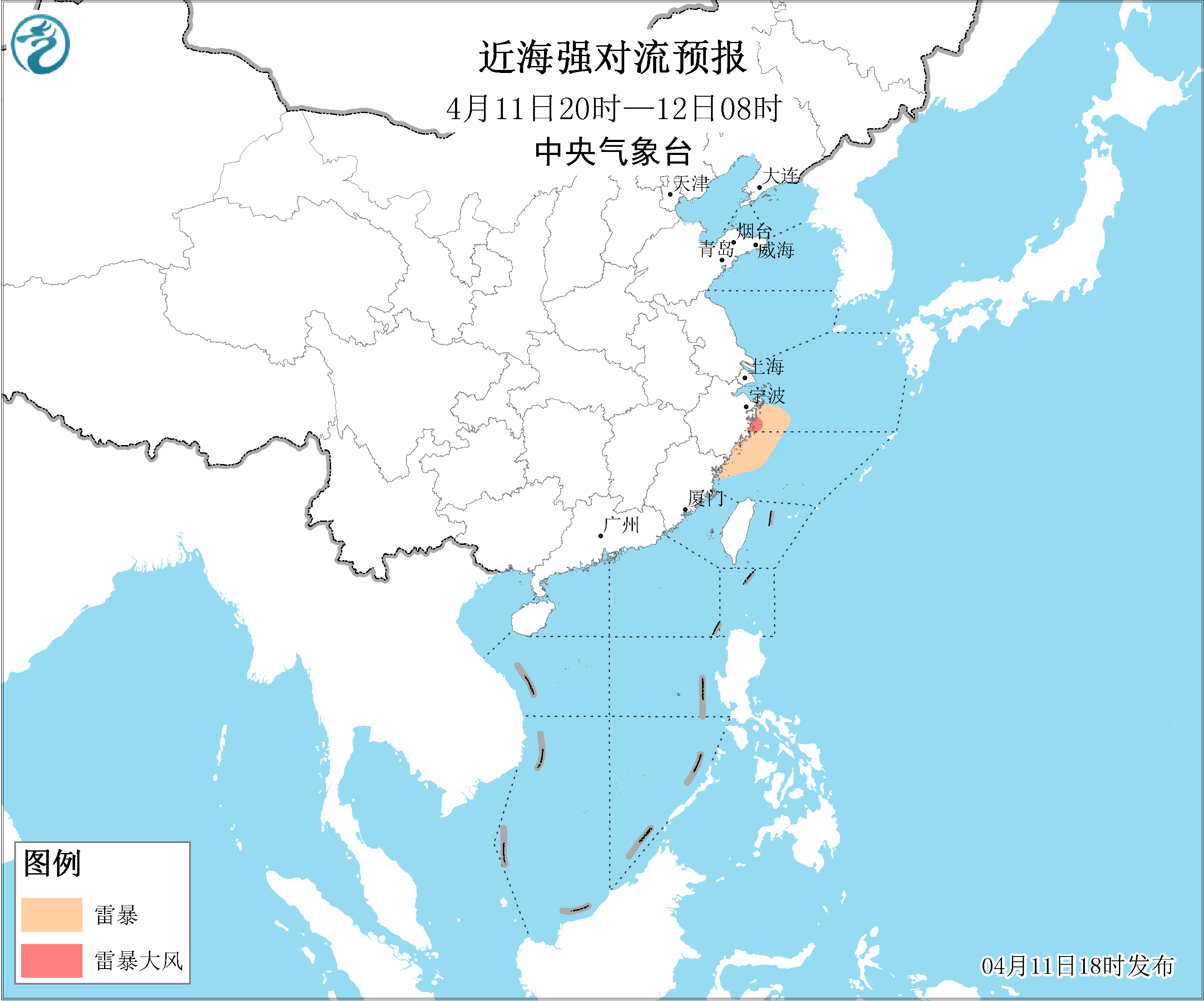 11日20时至12日20时,黄海中西部和南部海域将有能见度不足1公里的大雾,黄海北部海域将有能见度不足10公里的轻雾。东海北部海域将有5~6级、阵风7级的偏东风,北部湾、南海西北部海域将有5~6级、阵风7级的偏南风。此外,11日夜间,浙江中东部沿岸海域将有8~10级雷暴大风。