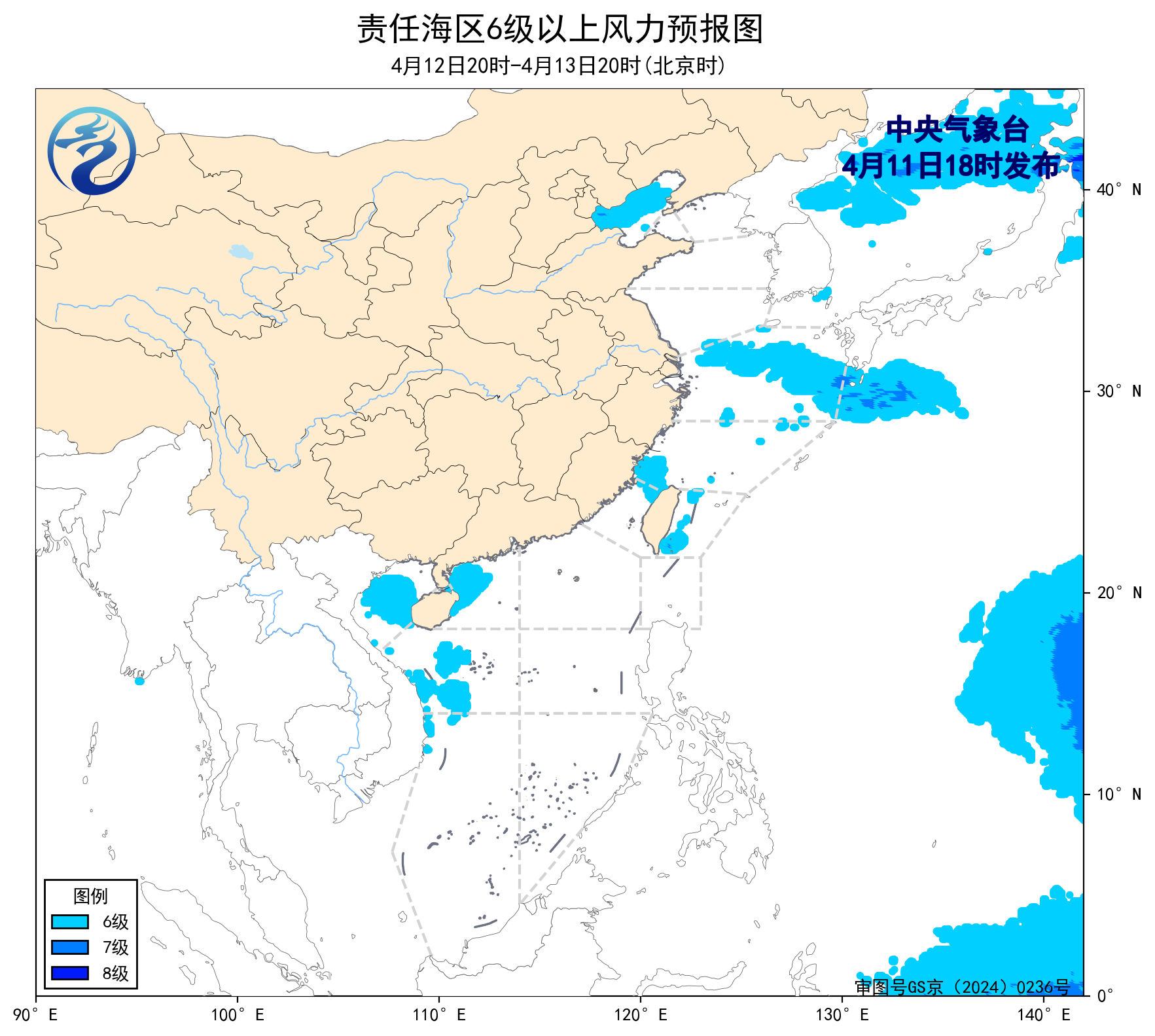 预计,4月14日夜间至18日白天,渤海、渤海海峡、台湾海峡、台湾以东洋面、巴士海峡、北部湾、琼州海峡、南海西北部和中西部海域将有5~6级、阵风7级的风,黄海北部和南部海域、东海大部海域将有6~7级、阵风8级的风。