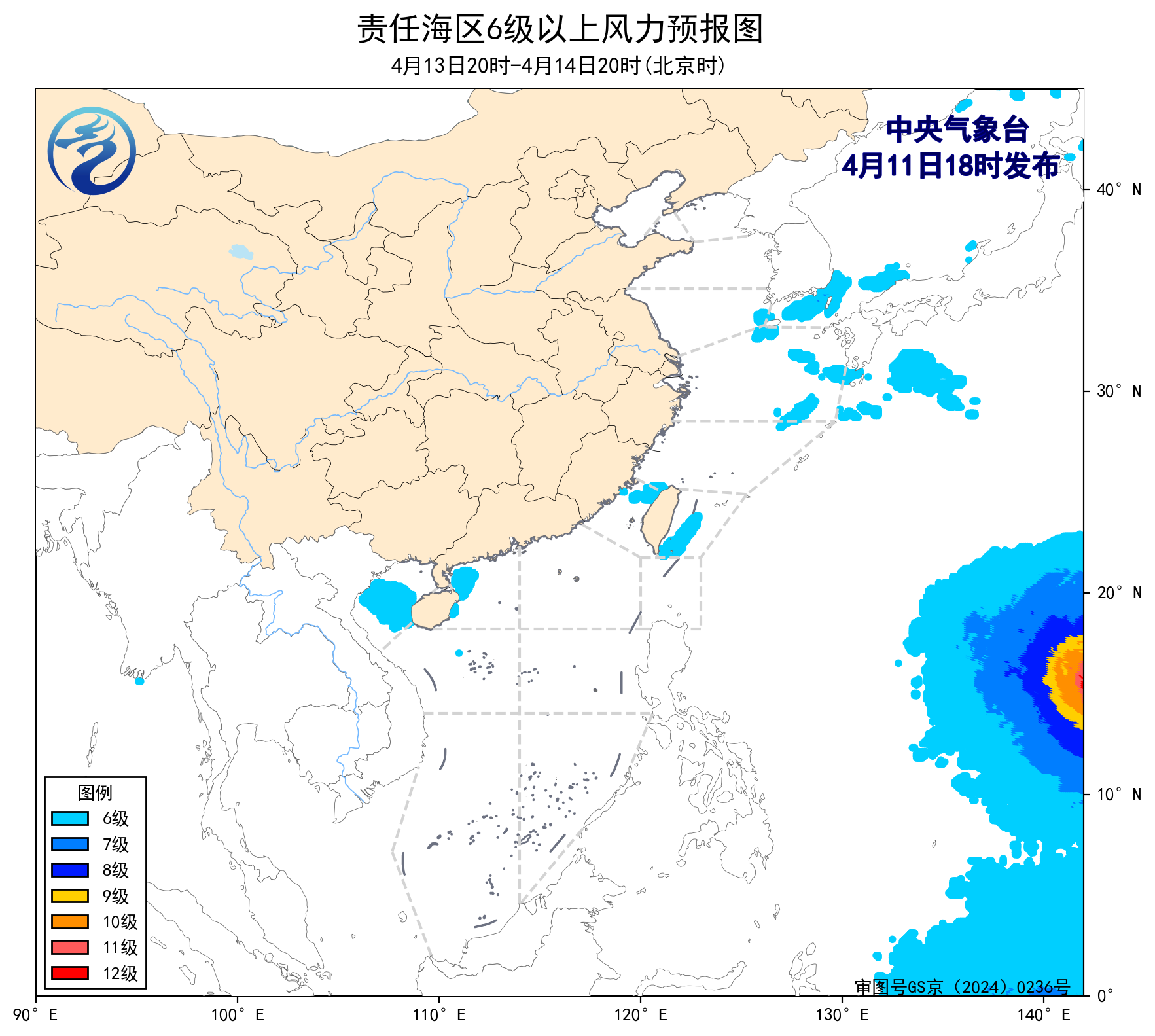 12日20时至13日20时,北部湾将有5~6级、阵风7级的偏南到东南风,渤海、东海北部海域将有5~6级、阵风7级的偏东到东北风。
