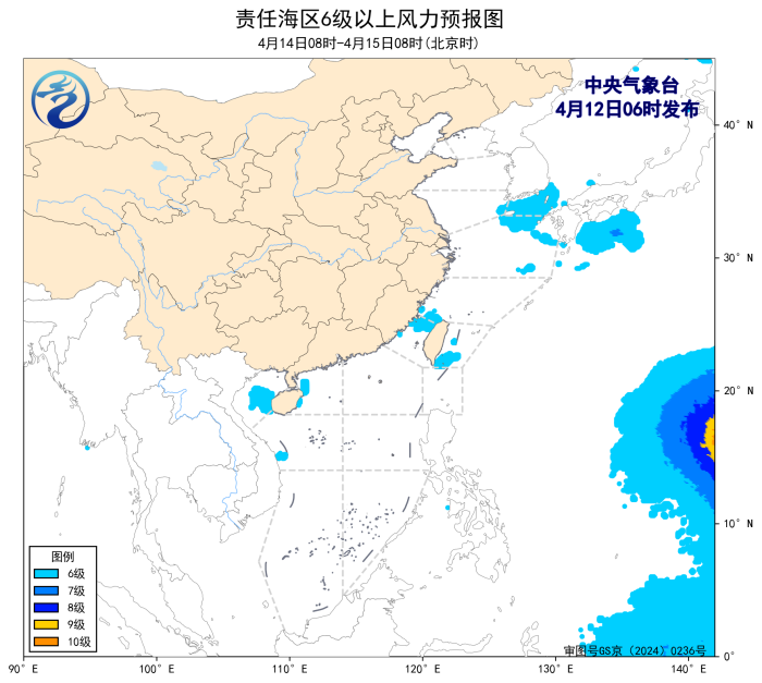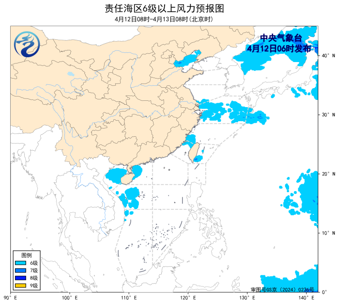 4月11日14时至12日02时,南海西北部海域、北部湾出现了5~6级、阵风7级的偏南风。黄海中部和东南部海域出现了能见度不足1公里的大雾。