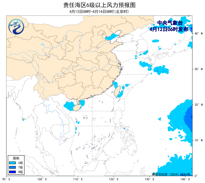 13日08时至14日08时,渤海将有5~6级、阵风7级的东北风,北部湾将有5~6级、阵风7级的偏南风。