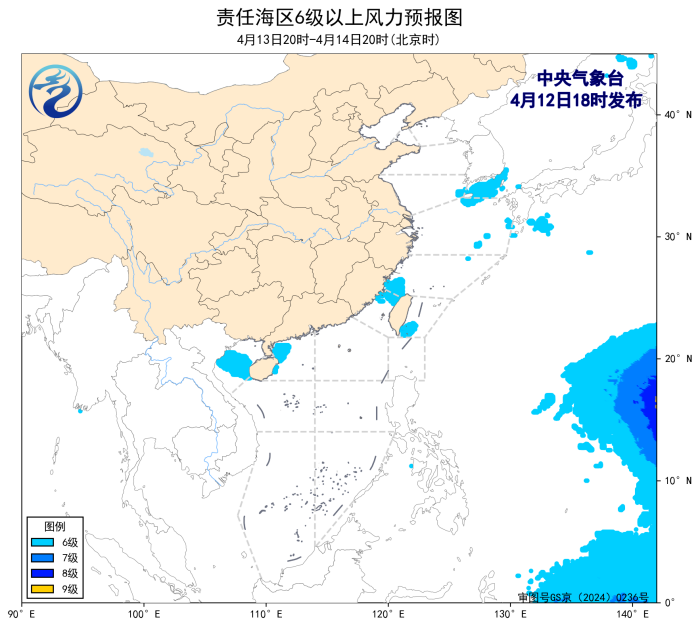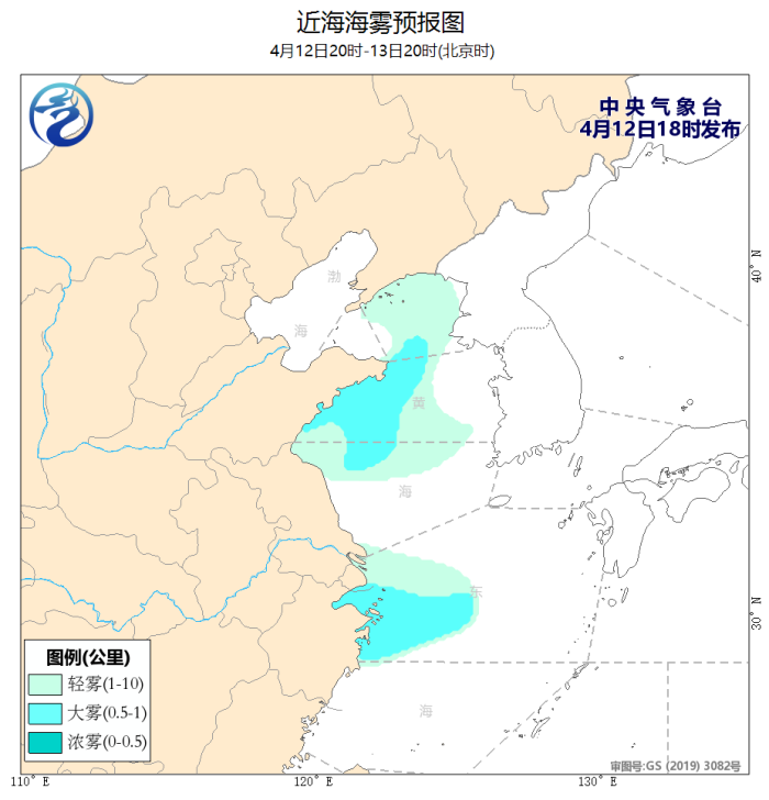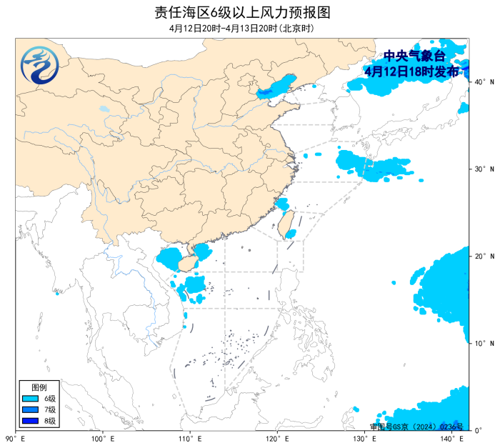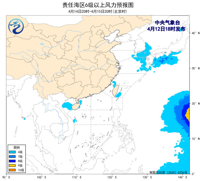4月12日02时至14时,东海北部海域出现了5~6级、阵风7级的偏东风,台湾以东洋面、南海西北部海域、北部湾出现了5~6级、阵风7级的偏南风。黄海中部和南部海域出现了能见度不足1公里的大雾。