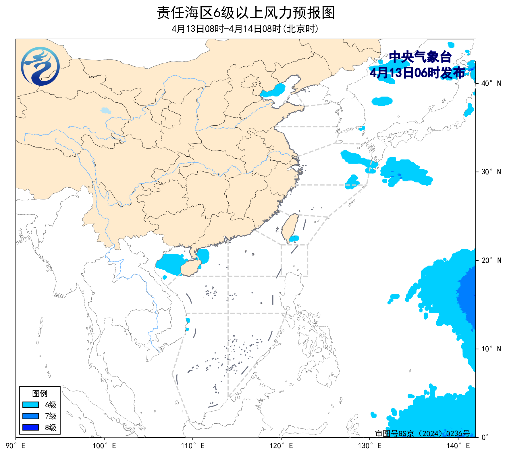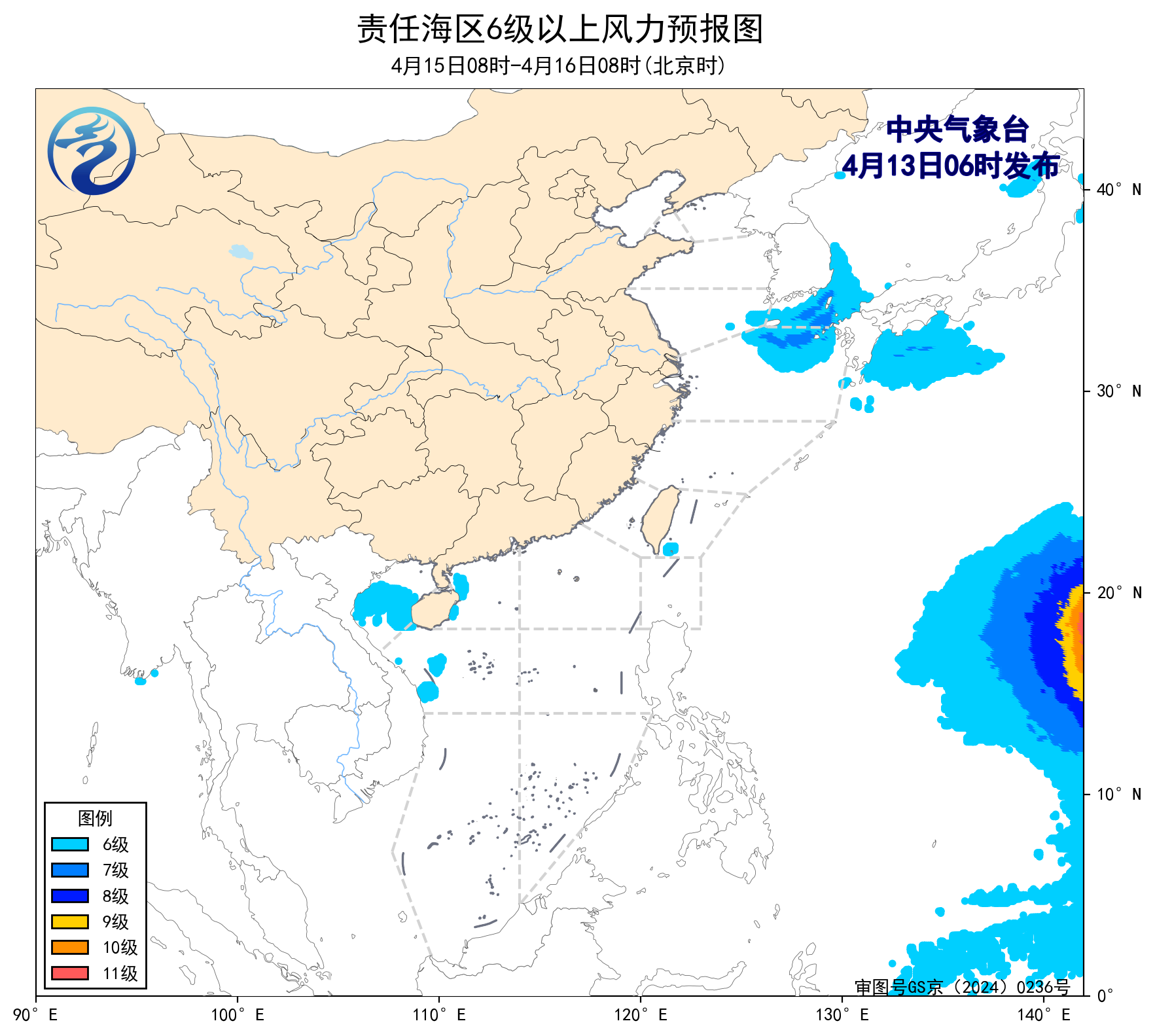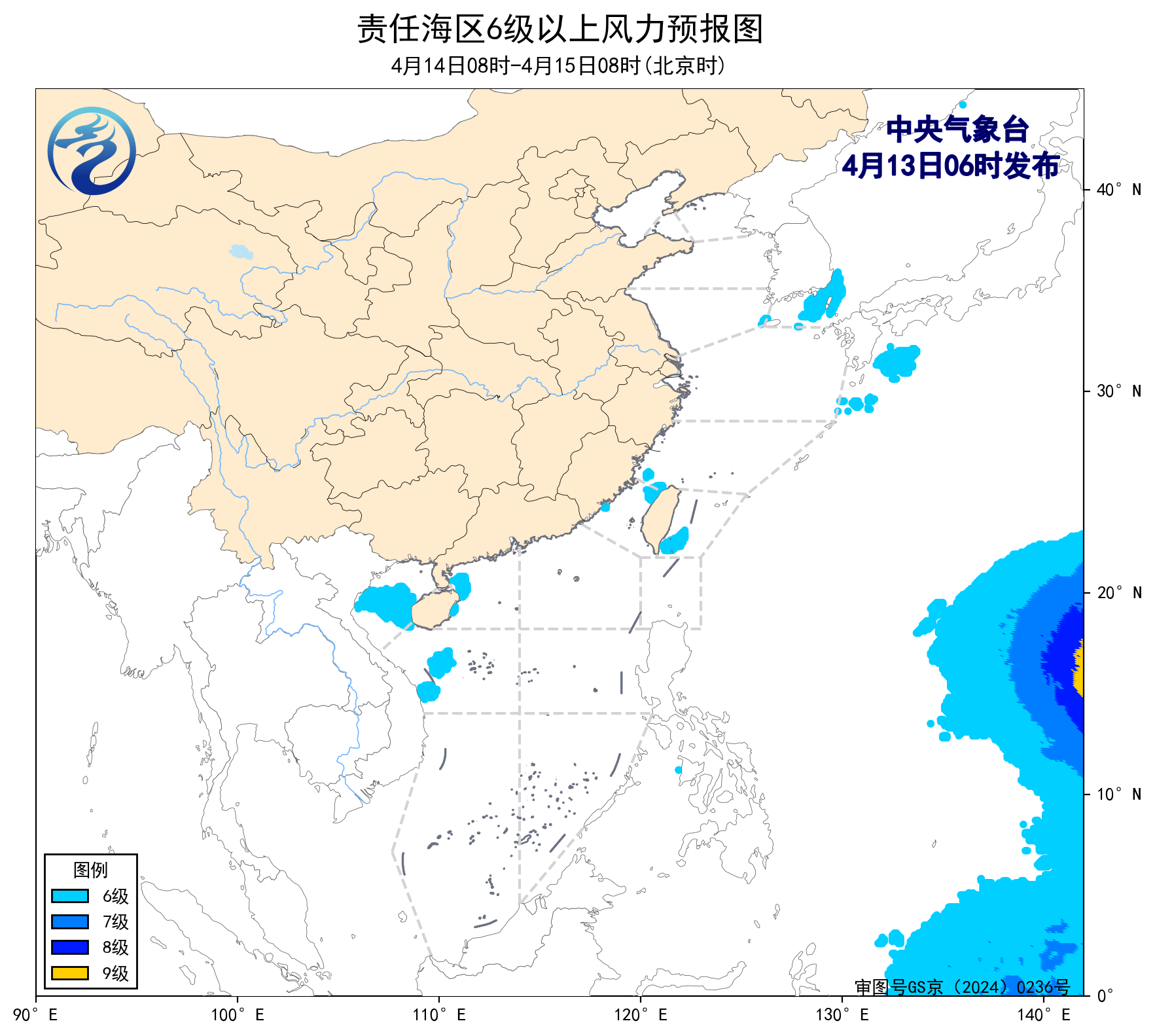 4月12日14时至13日02时,东海北部海域出现了5~6级、阵风7级的旋转风,台湾以东洋面、南海西北部海域、北部湾出现了5~6级、阵风7级的偏南风。东海北部海域出现了能见度不足1公里的大雾。