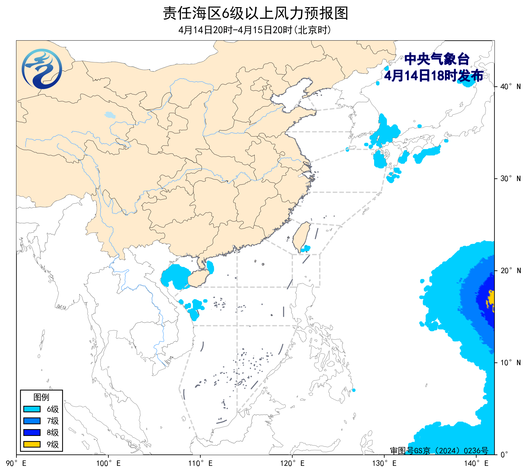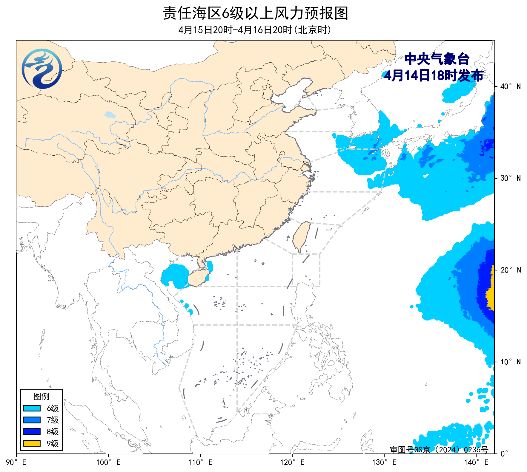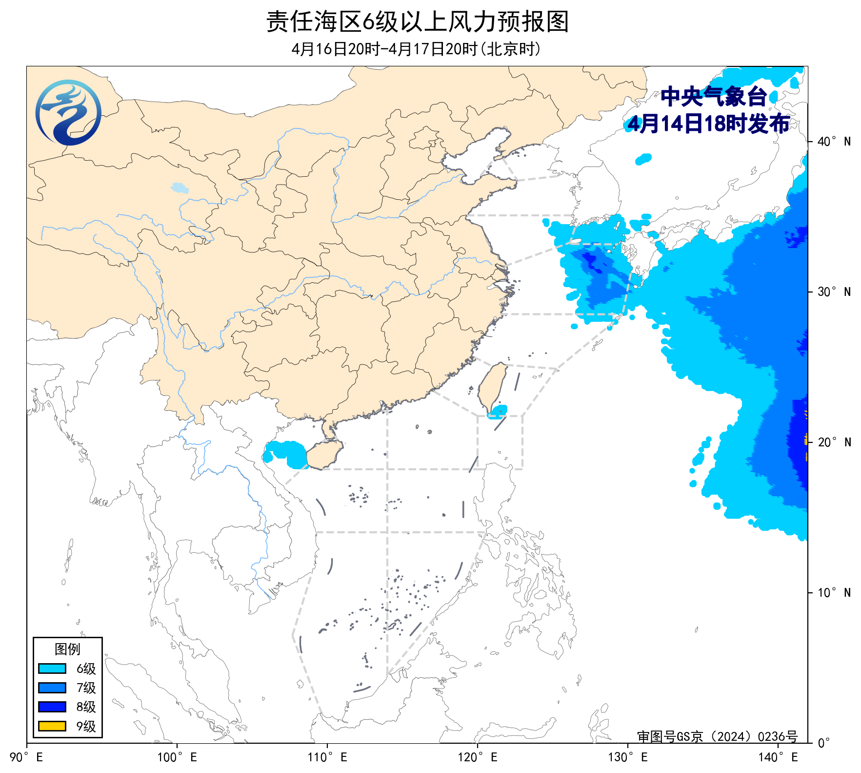 预计,4月17日夜间至21日白天,渤海将有6~7级、阵风8级增大至8~9级、阵风10级的大风,渤海海峡、台湾以东洋面、巴士海峡、北部湾、南海西北部和中西部海域将有5~6级、阵风7级的风,黄海大部海域、东海大部海域将有6~8级、阵风9级的大风,台湾海峡将有6~7级、阵风8级的风。