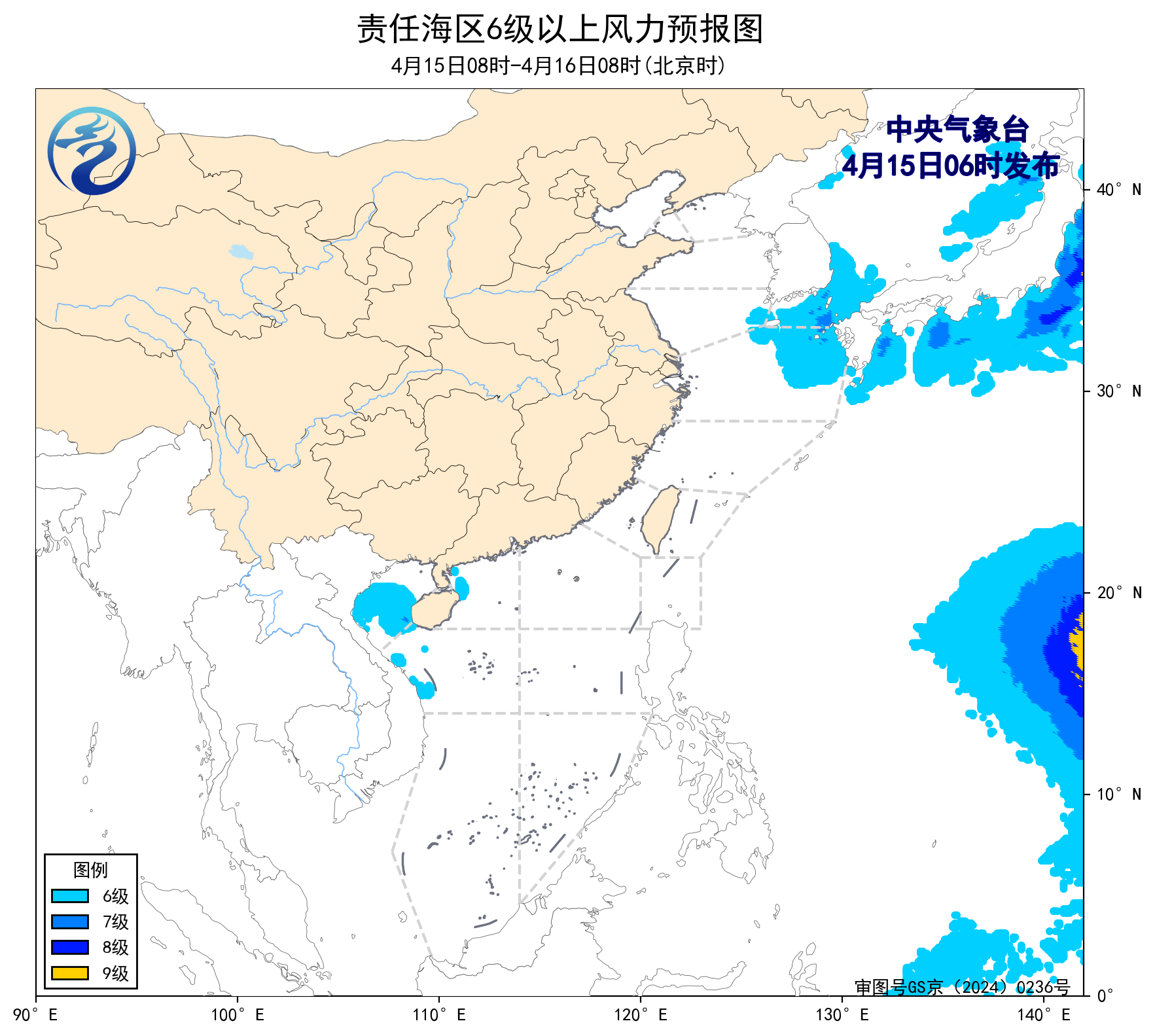 15日08时至16日08时,东海东北部海域将有5~6级、阵风7级的东北风,北部湾将有5~6级、阵风7级的东南风。