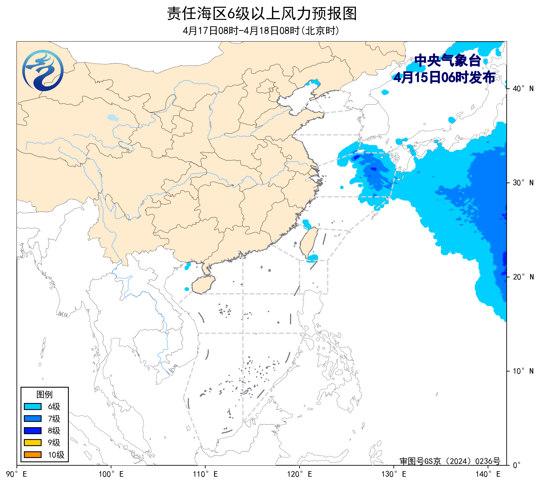 17日08时至18日08时,东海东北部海域将有6~7级、阵风8级的东南风。