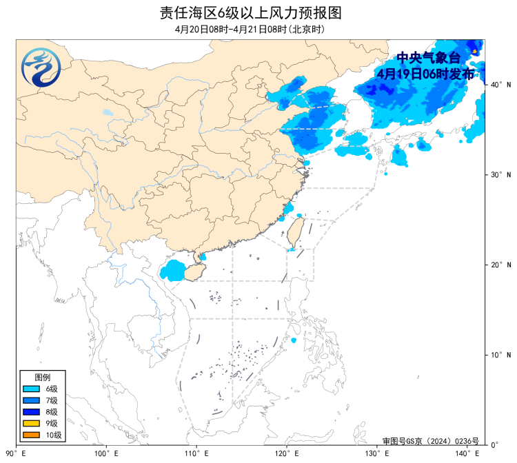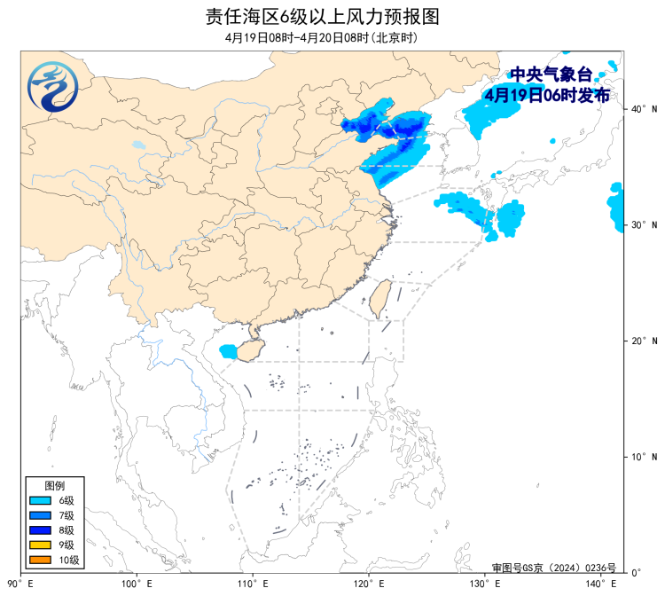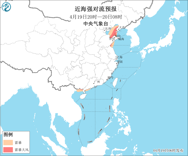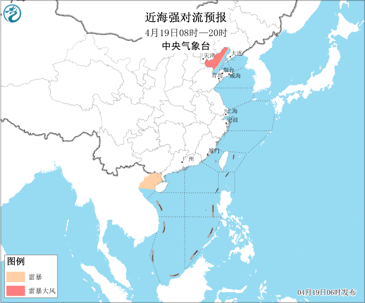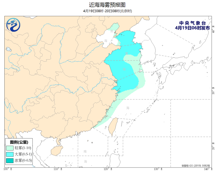 19日08时至20时,黄海北部和中部海域、辽东半岛东部沿岸海域、山东半岛南部沿岸海域、成山头附近海域、大连港、青岛港将有能见度不足1公里的大雾;19日08时至20日08时,黄海南部海域、东海西北部海域、江苏东部沿岸海域、长江口及杭州湾附近海域将有能见度不足1公里的大雾;渤海、渤海海峡将有8~10级雷暴大风,黄海北部海域、黄海中西部和西南部海域将有7~8级、阵风9级的大风,黄海中东部海域将有5~6级、阵风7级的偏北风。