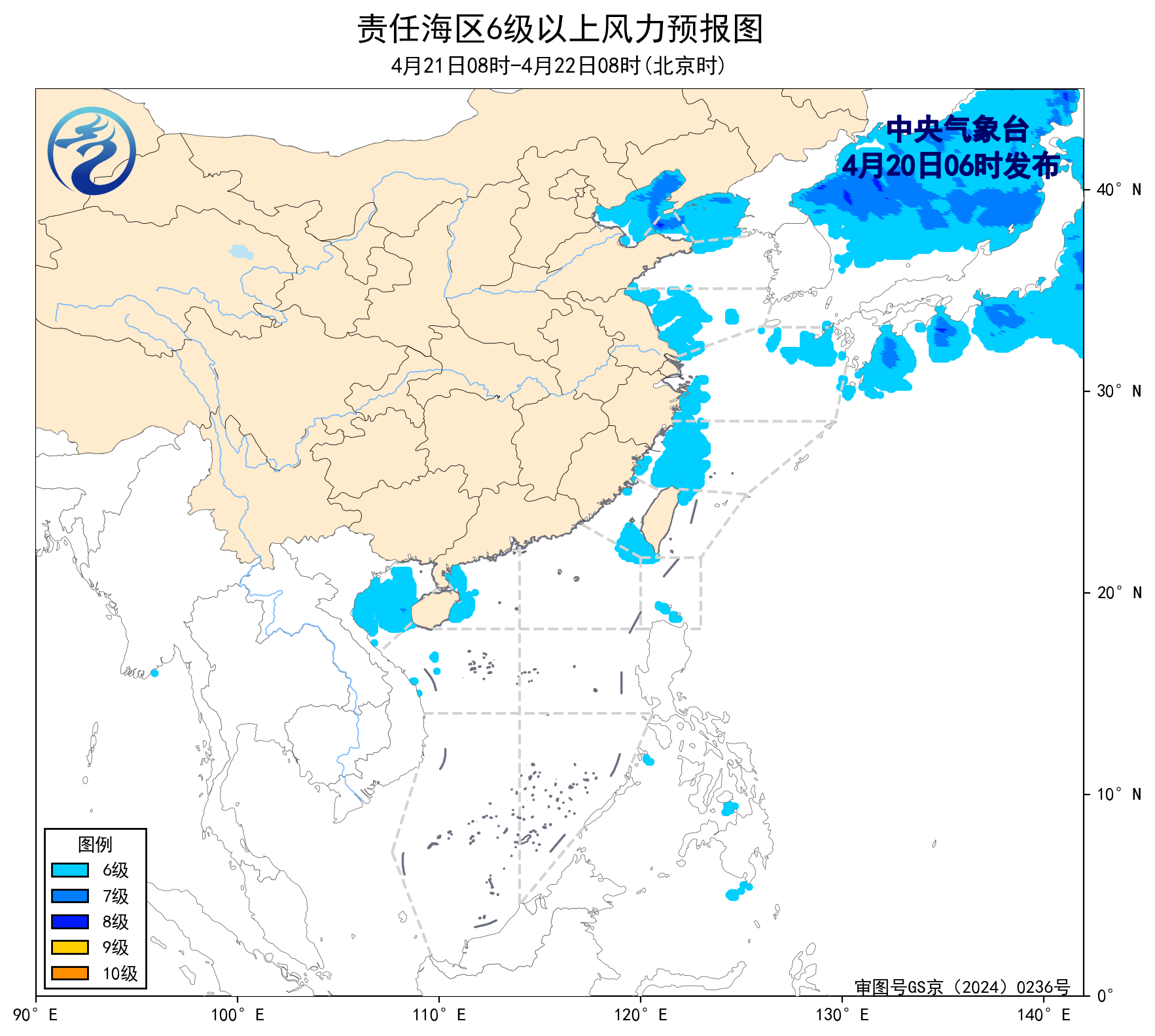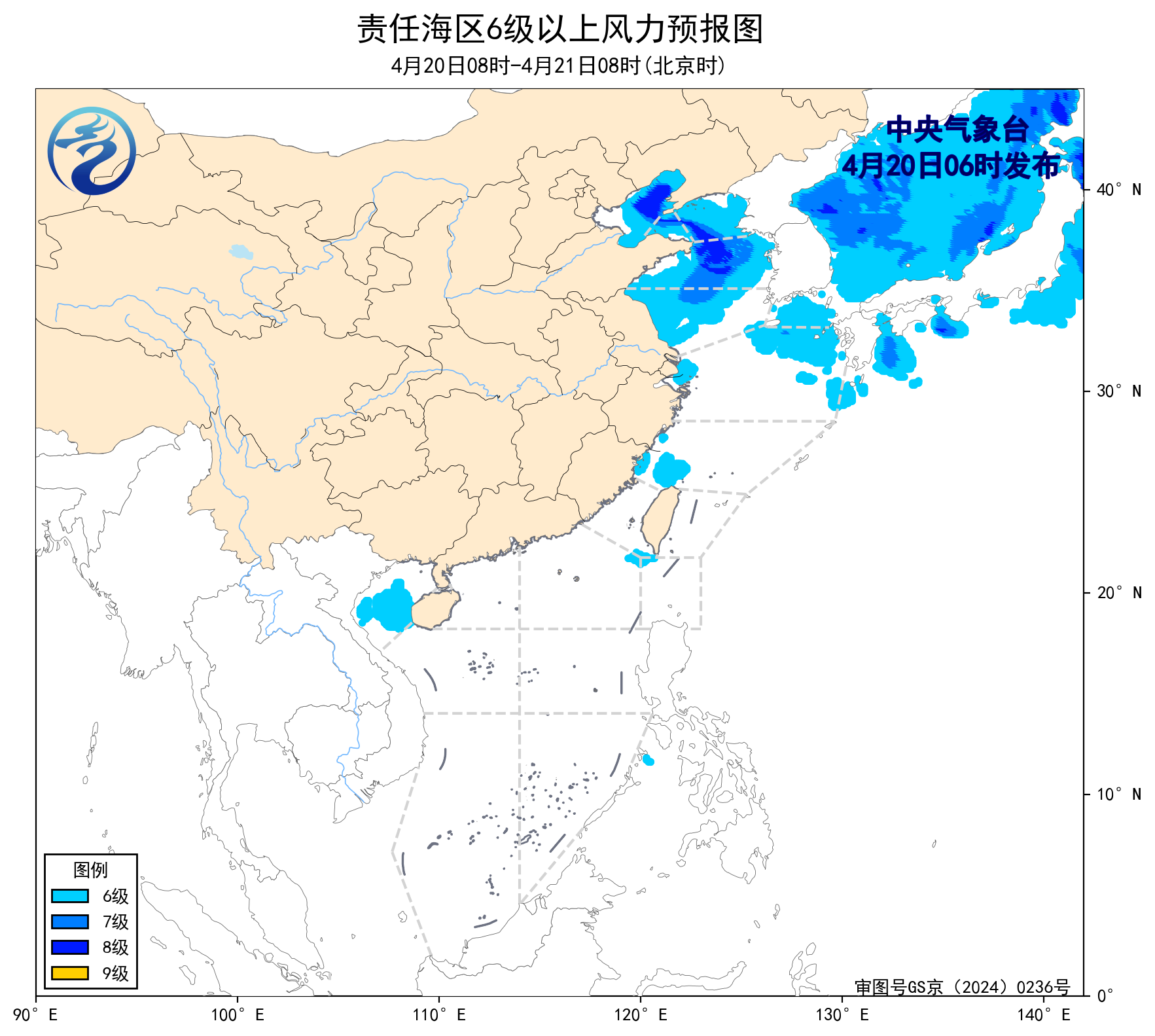 20日08时至21日08时,渤海、渤海海峡、黄海北部海域、黄海中西部和西南部部分海域将有7~8级、阵风9级的大风,北部湾将有5~6级、阵风7级的东南风。