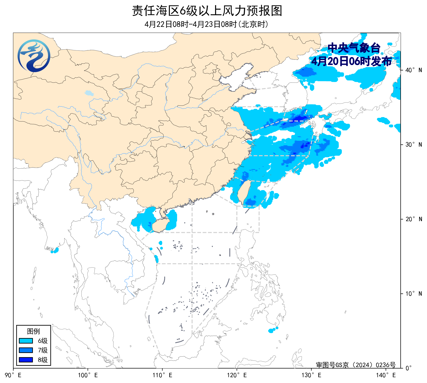 22日08时至23日08时,东海北部海域将有6~7级、阵风8级的西南风,黄海南部海域将有5~6级、阵风7级的偏东到东北风,东海南部海域、台湾海峡、台湾以东洋面将有5~6级、阵风7级的偏南到西南风,北部湾、南海西北部海域将有5~6级、阵风7级的偏南到东南风。