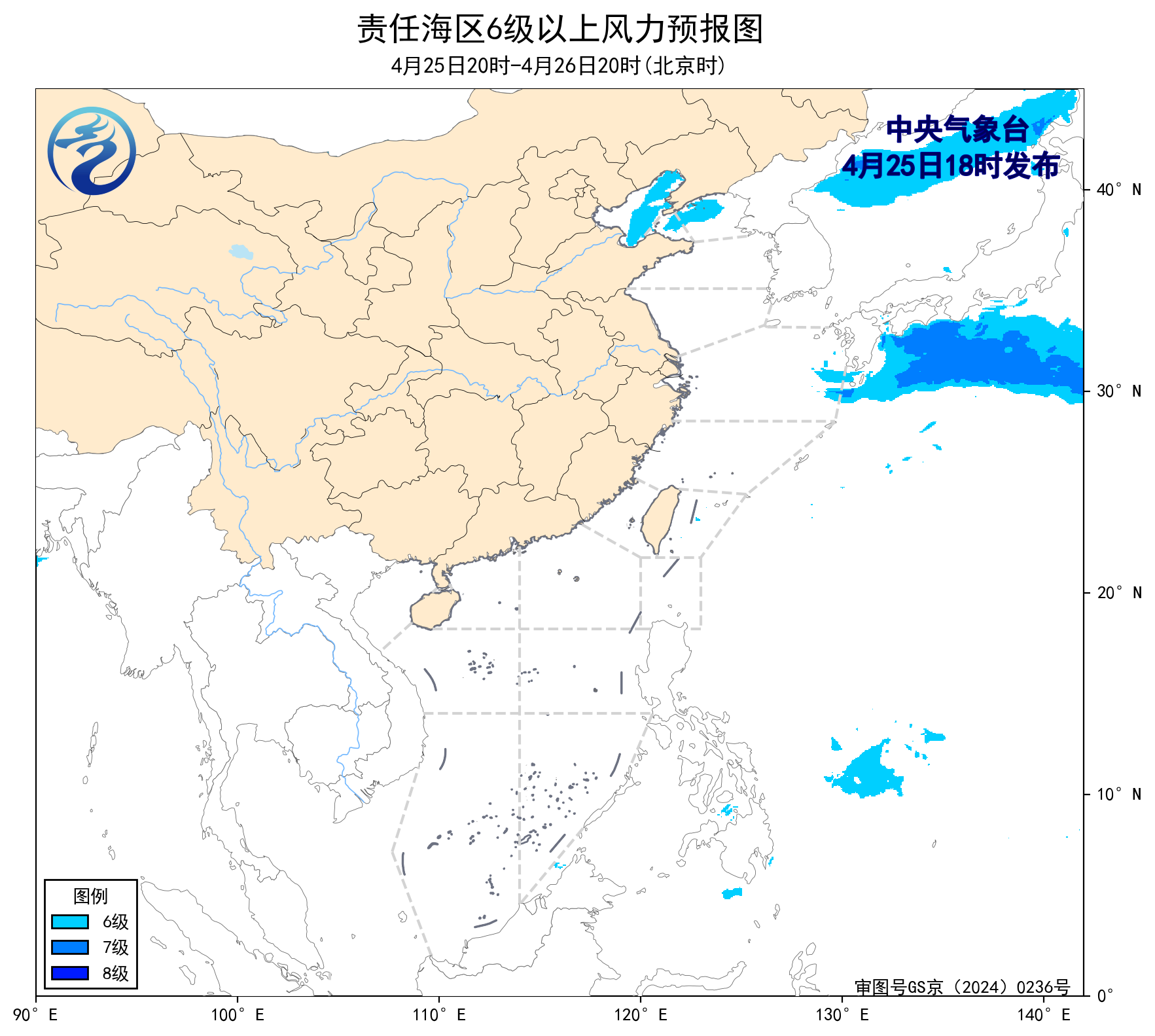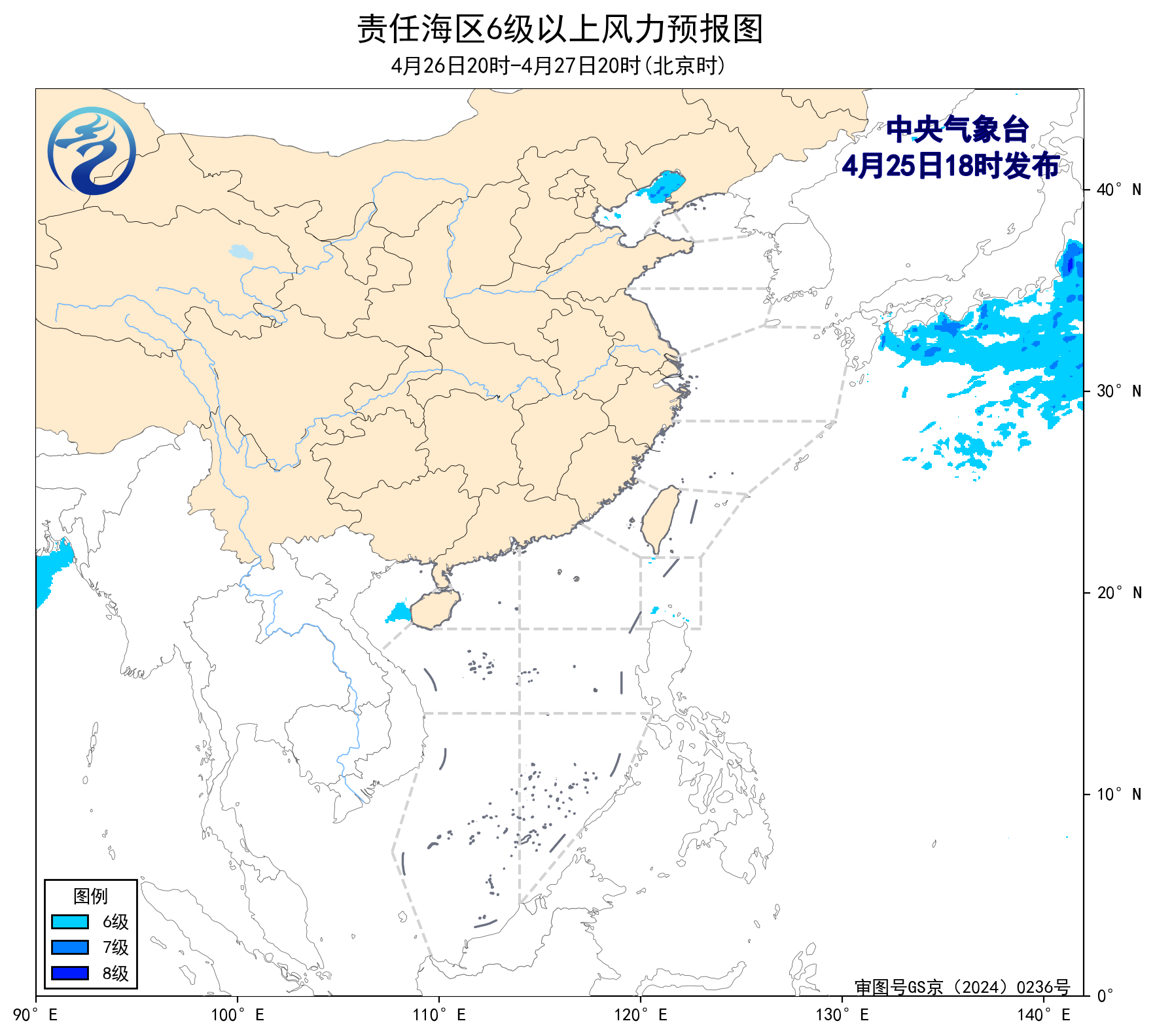 25日20时至26日20时,渤海、渤海海峡、黄海北部海域将有5~6级、阵风7级的偏南到西南风。