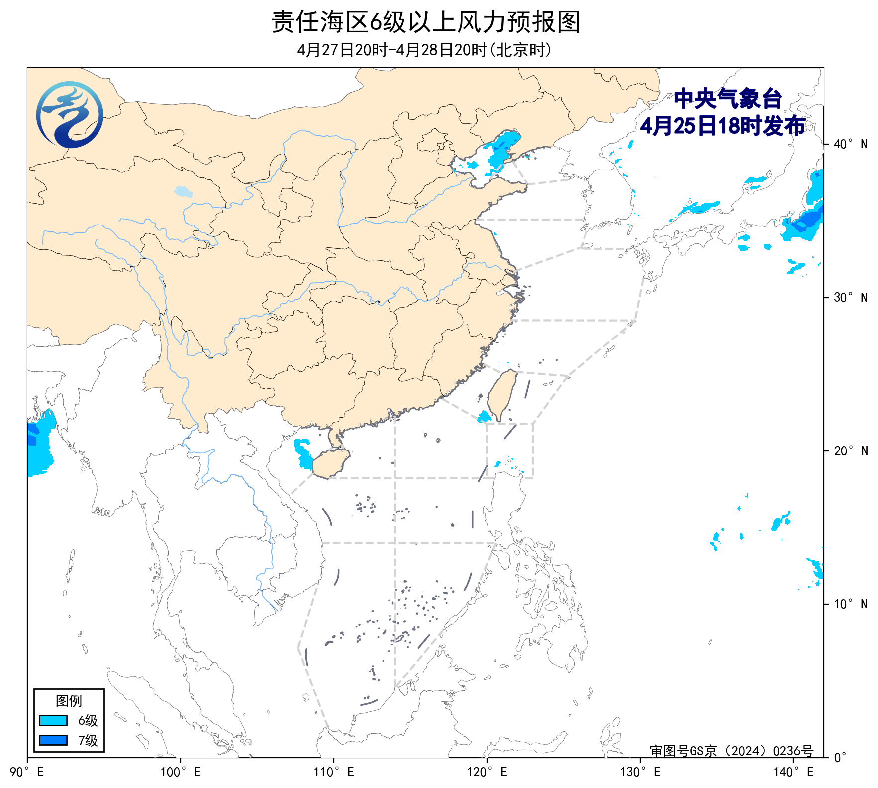 预计,4月28日夜间至5月2日白天,渤海将有5~6级、阵风7级的风,东海大部海域将有8~9级、阵风10级减弱至6~7级、阵风8级的风,台湾海峡将有7~8级、阵风9级的大风,台湾以东洋面将有6~8级、阵风9级的大风,巴士海峡、北部湾、南海西北部海域、南海东北部海域、南海中西部海域、南海中东部海域将有6~7级、阵风8级的风。