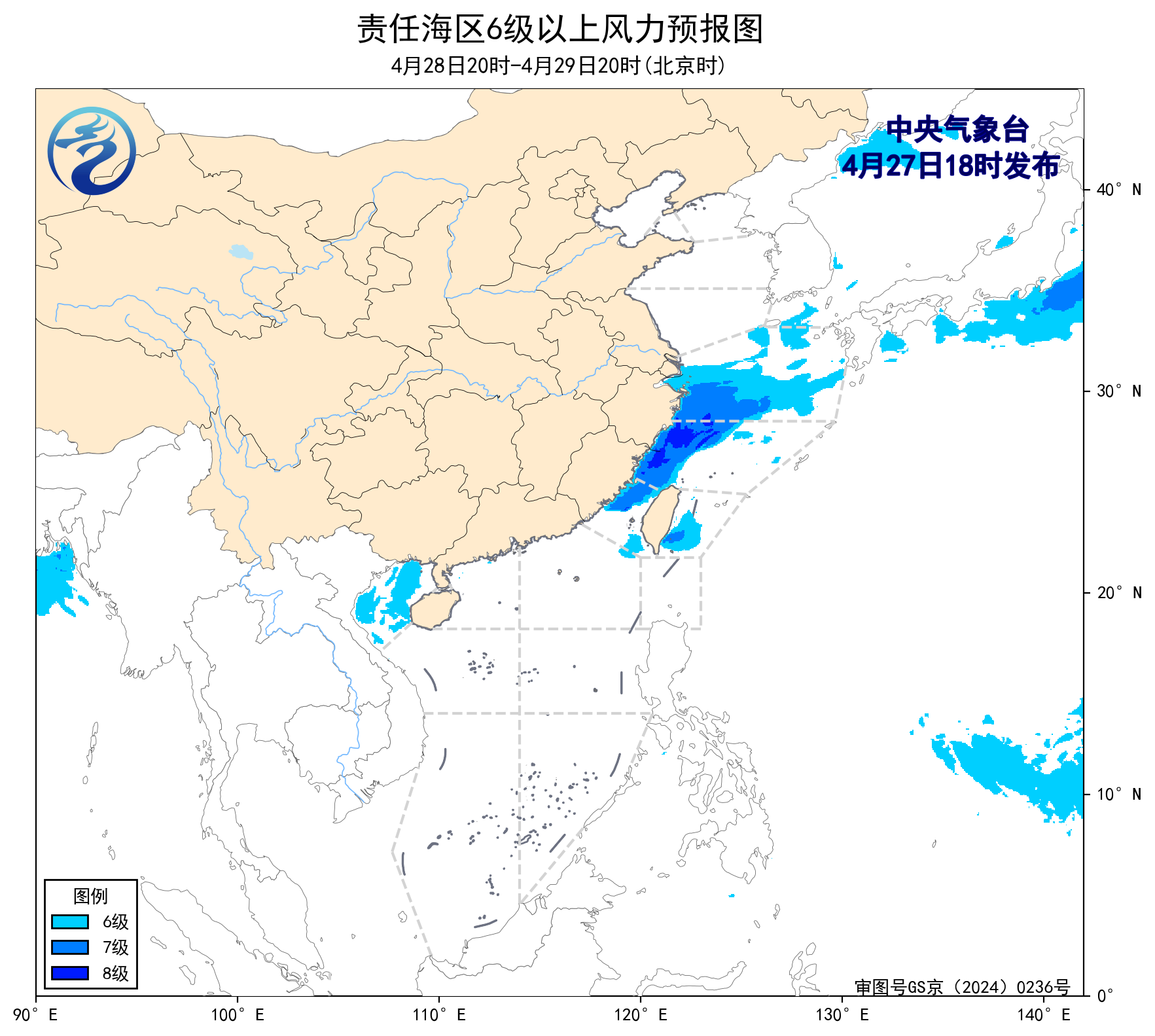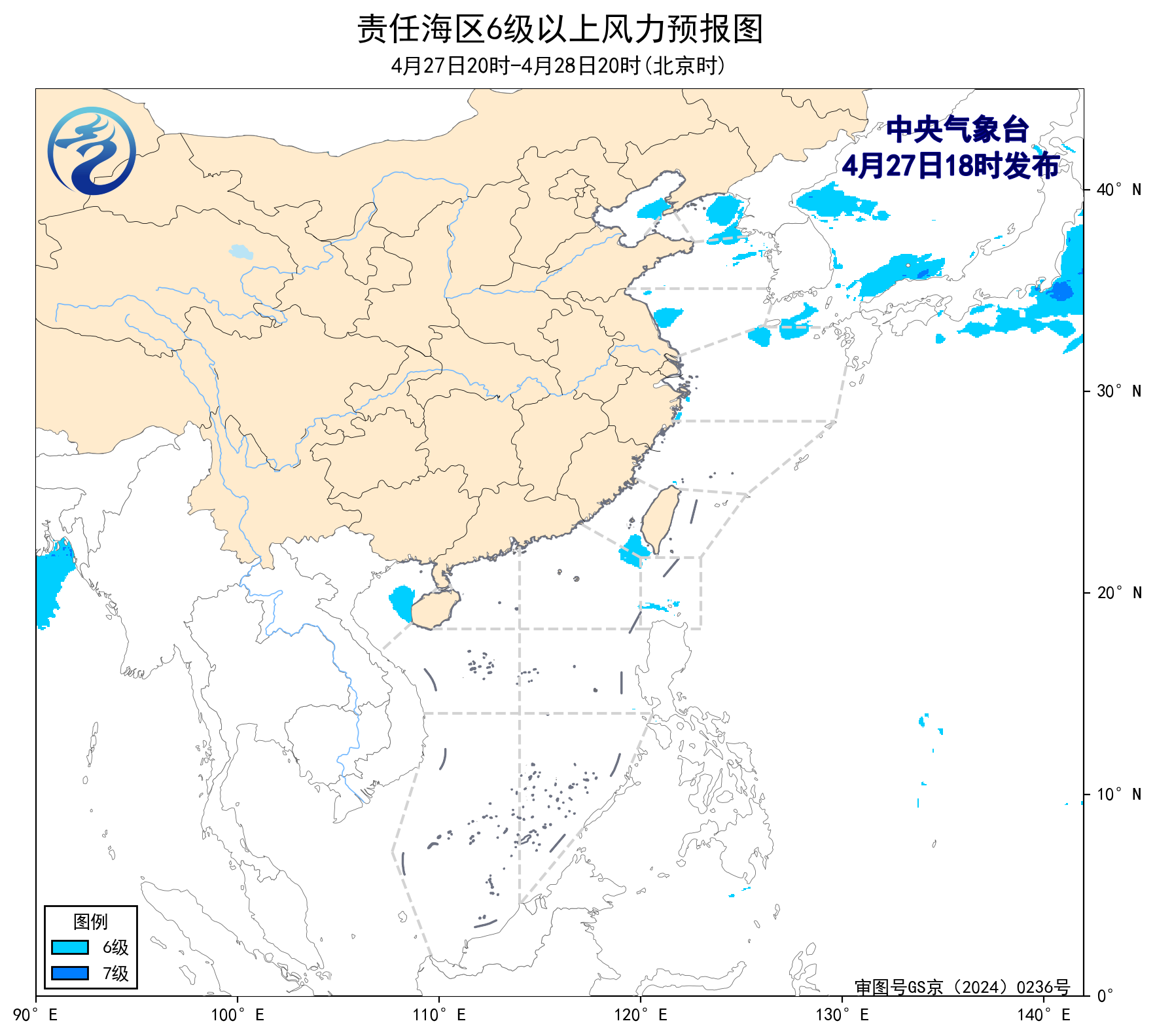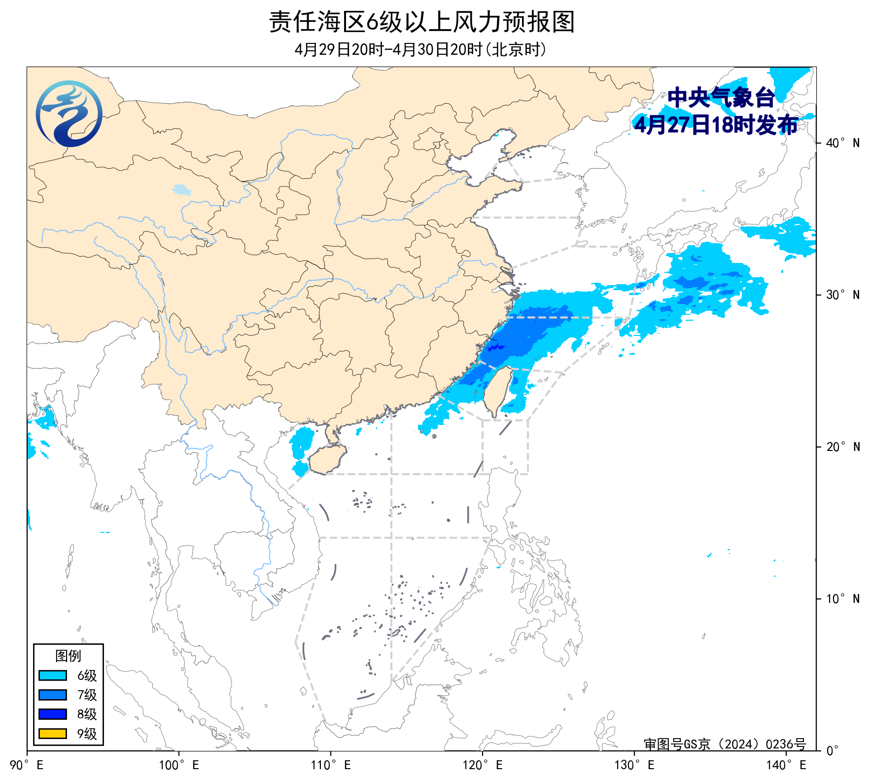 4月27日02时至14时,我国近海以4-5级风为主。