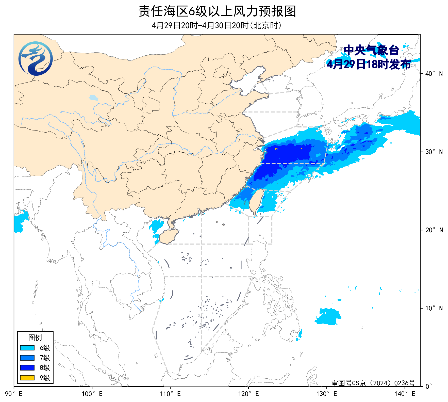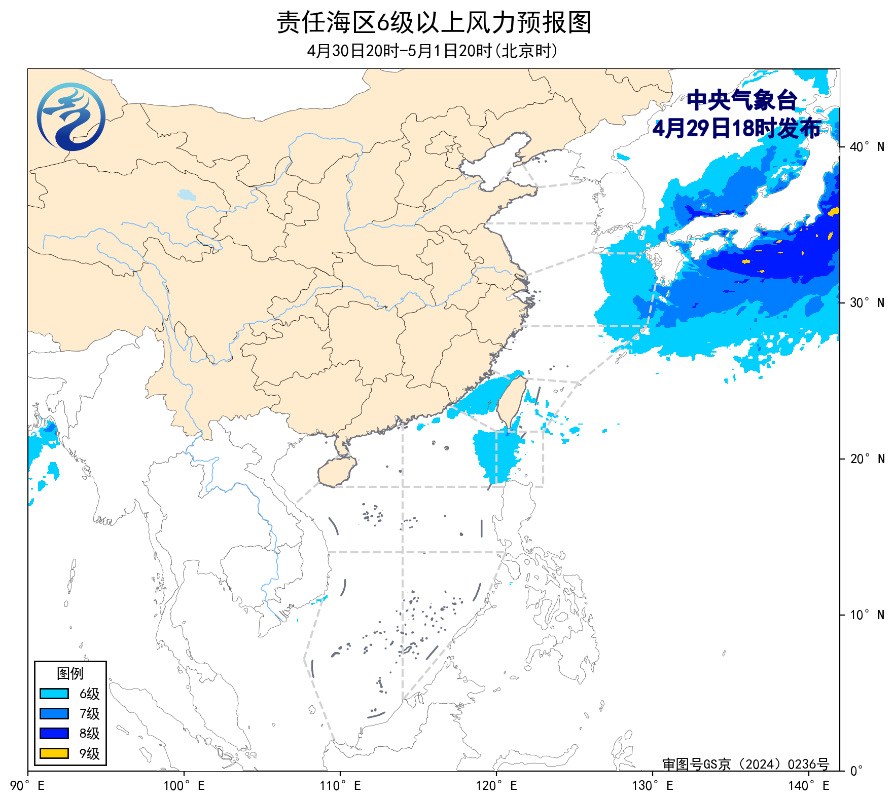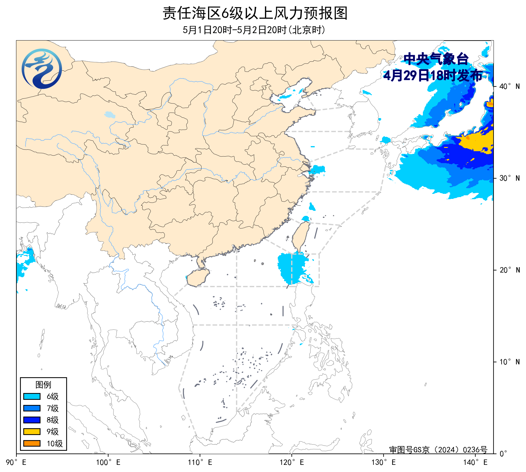 预计,5月2日夜间至6日白天,渤海、黄海中部和南部海域、北部湾将有5~6级、阵风7级的风,东海大部海域将有6~8级、阵风9级的大风,台湾海峡、台湾以东洋面、巴士海峡、南海西北部海域、南海东北部海域、南海东南部海域将有6~7级、阵风8级的风。