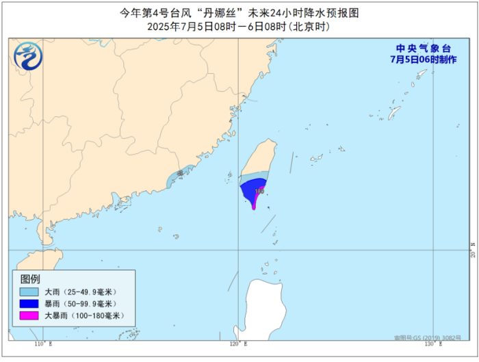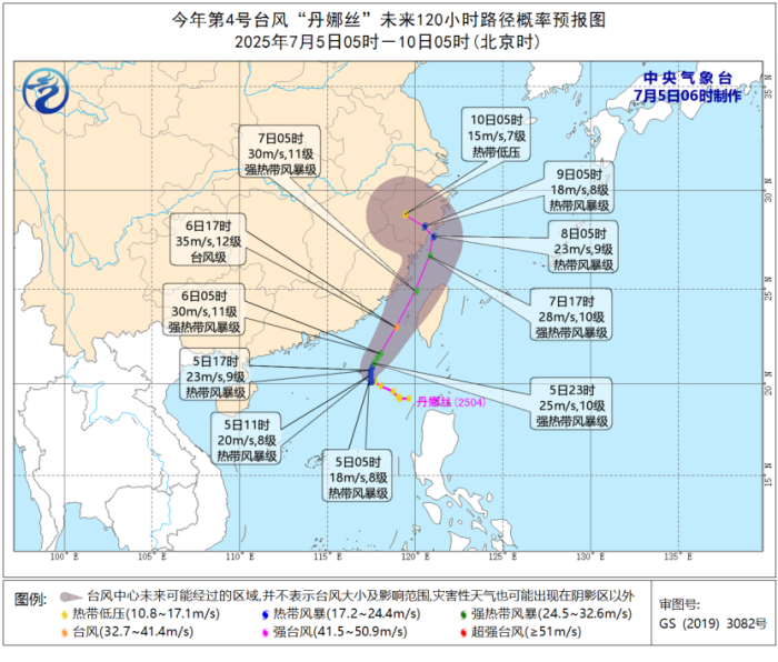 据中央气象台观测,位于南海的热带低压,已经在7月5日凌晨增强为今年第4号台风“丹娜丝”。受台风影响,5日8时至6日8时,南海东部和南部、台湾海峡南部、巴士海峡西部、广东东部沿海、福建南部沿海、台湾岛南部沿海将有7—9级大风,“丹娜丝”中心经过的附近海域风力可达10—12级、阵风13级。