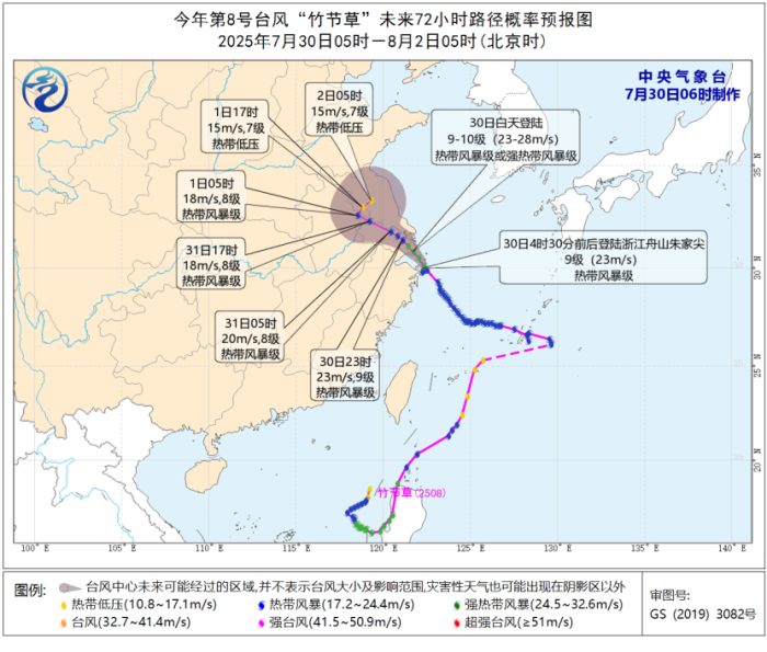 今年第8号台风“竹节草”的中心于7月30日4时30分前后在浙江省舟山市朱家尖岛沿海登陆,又于16时40分前后在上海市奉贤区沿海再次登陆,登陆时减弱为热带风暴级,中心附近最大风力有9级。中央气象台7月30日继续发布暴雨橙色预警、台风黄色预警、大风黄色预警。预计,浙江中北部、上海、江苏大部、安徽东部、山东半岛南部、辽宁东部、吉林东北部、黑龙江东部、新疆伊犁河谷和南疆西部等地部分地区有大到暴雨,其中,浙江北部、上海、江苏中南部、安徽东南部等地部分地区有大暴雨,江苏南部等地局地特大暴雨;黄海中西部和南部海域、东海北部海域、台湾以东洋面、巴士海峡将有7~8级、阵风9~10级的大风,其中黄海西南部海域、东海西北部海域风力可达9~10级、阵风11~12级。