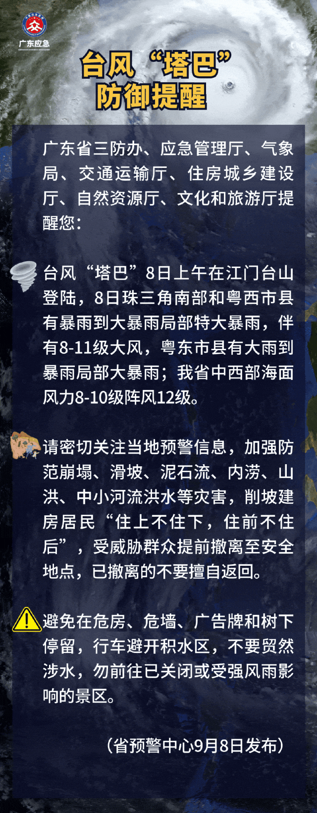 中央气象台9月8日继续发布台风黄色预警、暴雨黄色预警。今年第16号台风“塔巴”已于8日上午在广东省台山市沿海登陆,登陆时中心附近最大风力11级,预计将于傍晚前后移入广西境内并减弱为热带低压。“塔巴”将给广东、广西等地带来强风雨天气,预计8日14时至9日14时,广东西部和南部沿海、广西中东部有暴雨到大暴雨,其中,广西东南部局地有特大暴雨;江苏中南部、安徽、湖北东部、浙江西北部、江西北部、湖南南部等地部分地区有大雨,局地暴雨。