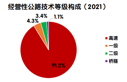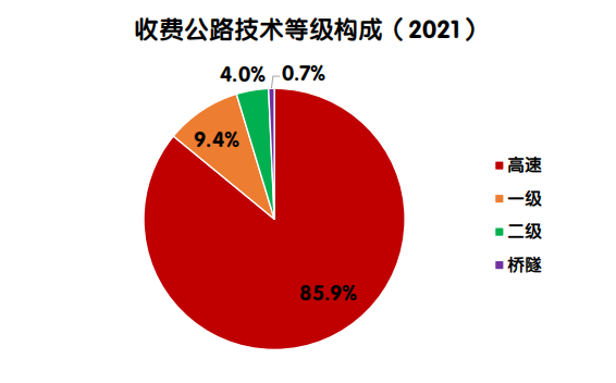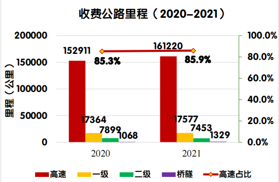 2021年末,全国收费公路里程18.76万公里,占公路总里程528.07万公里的3.55%。其中,高速公路16.12万公里,一级公路1.76万公里,二级公路0.75万公里,独立桥梁及隧道1329公里,占比分别为85.9%、9.4%、4.0%和0.7%。