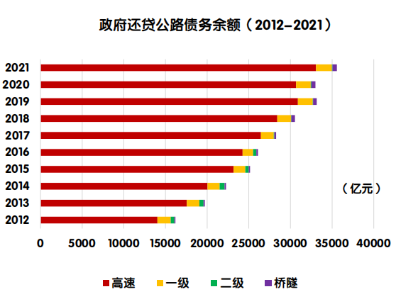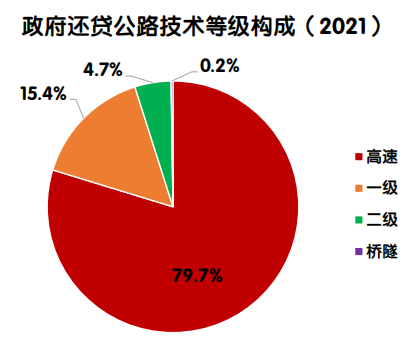 2021年末,政府还贷公路债务余额35572.8 亿元,占全国收费公路债务余额的44.9%。其中,高速公路债务余额33065.4亿元,一级公路1904.8亿元,二级公路78.8亿元,独立桥梁及隧道523.8亿元,占比分别为93.0%、5.4%、0.2%和1.5%。