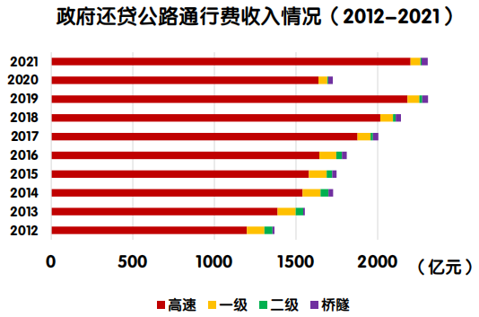 2021年度,政府还贷公路车辆通行费收入2307.0亿元,占收费公路车辆通行费收入总额的34.8%。其中,高速公路2201.2亿元,一级公路60.5亿元,二级公路7.3亿元,独立桥梁及隧道38.0亿元,占比分别为95.4%、2.6%、0.3%和1.6%。