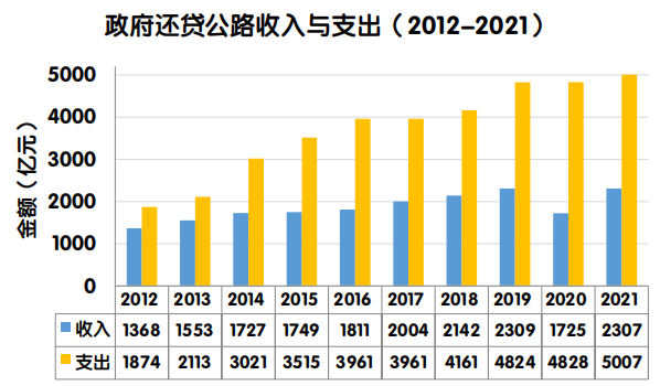 2021年度,全国政府还贷公路车辆通行费收支缺口为2699.6亿元。其中,政府还贷高速公路收支缺口2547.9亿元,一级公路收支缺口144.4亿元,二级公路收支盈余0.3亿元,独立桥梁及隧道收支缺口7.6亿元。剔除2020年疫情防控免费因素后,2021年政府还贷公路车辆通行费收支缺口同比增加161.5亿元,增长6.4%。