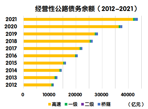 2021年末,经营性公路债务余额43605.7亿元,占收费公路债务余额的55.1%。其中,高速公路41788.5亿元,一级公路602.3亿元,二级公路43.3亿元,独立桥梁及隧道1171.6 亿元,占比分别为95.8%、1.4%、0.1%和2.7%。