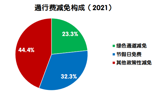 2021年度,全国收费公路共减免车辆通行费1178.9亿元,占2021年度应收车辆通行费总额的15.1%。其中,鲜活农产品运输“绿色通道”减免274.7 亿元,占比23.3%;重大节假日免收小型客车车辆通行费380.7 亿元,占比32.3%;高速公路差异化收费、ETC车辆通行费优惠、抢险救灾车辆免费等其他政策性减免523.5亿元,占比44.4%。剔除2020年疫情防控免费因素后,2021年车辆通行费减免金额同比增加91.0亿元,增长8.4%。