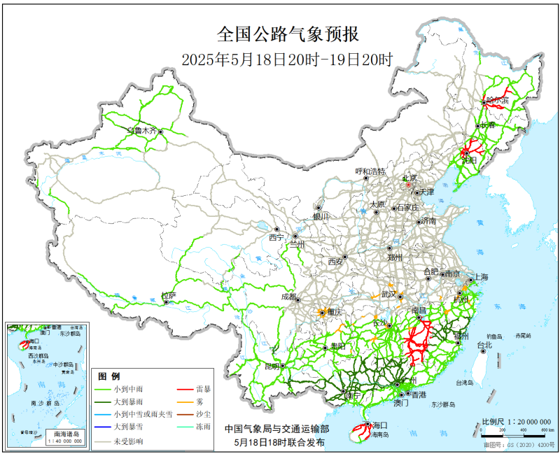中国气象局与交通运输部2025年5月18日联合发布全国主要公路气象预报