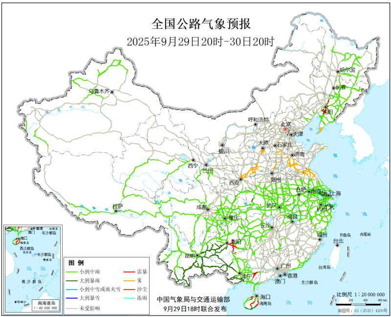 中国气象局与交通运输部2025年9月29日联合发布全国主要公路气象预报
