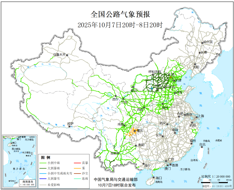 中国气象局与交通运输部2025年10月7日联合发布全国主要公路气象预报