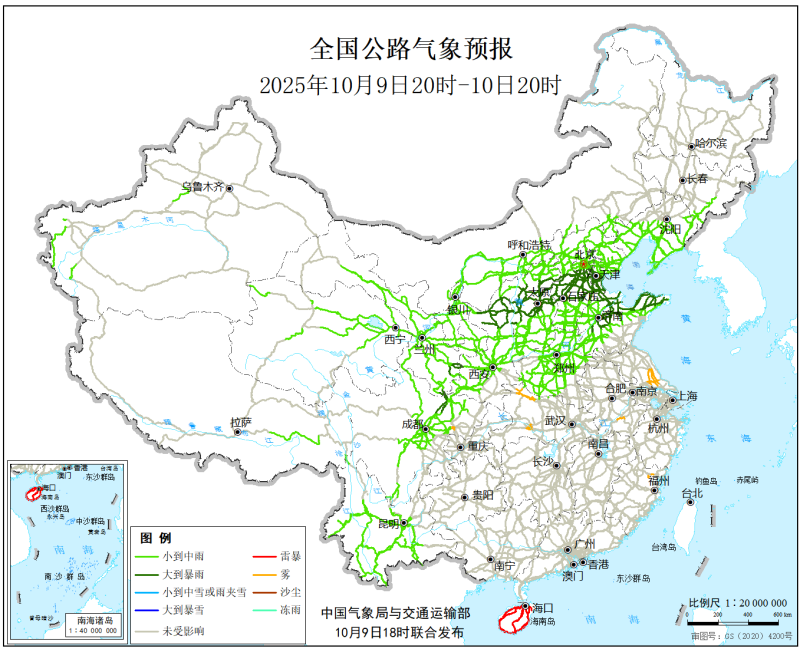 中国气象局与交通运输部2025年10月9日联合发布全国主要公路气象预报