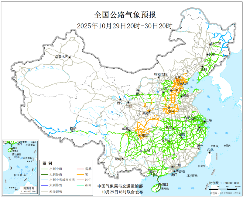 中国气象局与交通运输部2025年10月29日联合发布全国主要公路气象预报