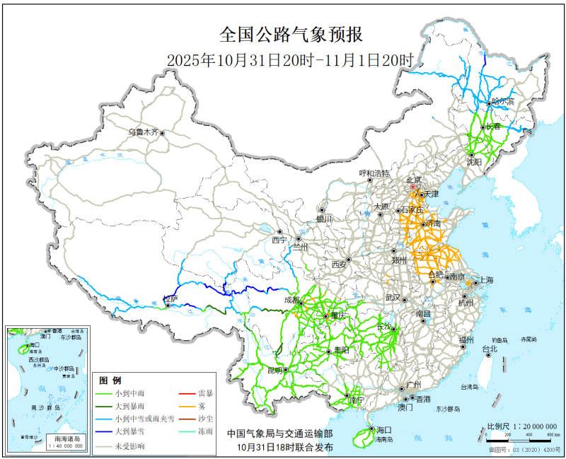 中国气象局与交通运输部2025年10月31日联合发布全国主要公路气象预报