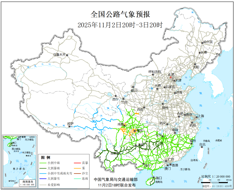 中国气象局与交通运输部2025年11月2日联合发布全国主要公路气象预报