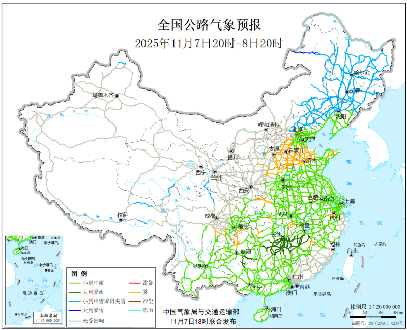 中国气象局与交通运输部2025年11月7日联合发布全国主要公路气象预报